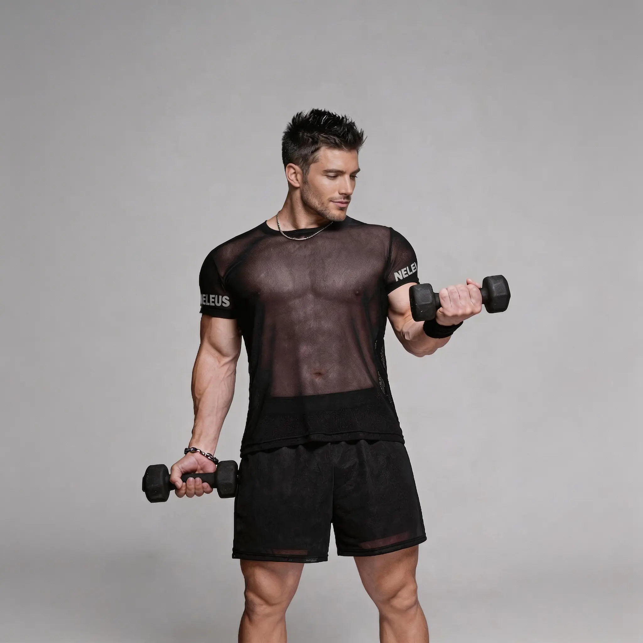 Elevate your gym wardrobe with the NELEUS Bare-Feel Mesh Short Sleeve Tee, crafted from 90% polyester and 10% spandex fabric, the ultimate fusion of performance, comfort, and head-turning style for active men.