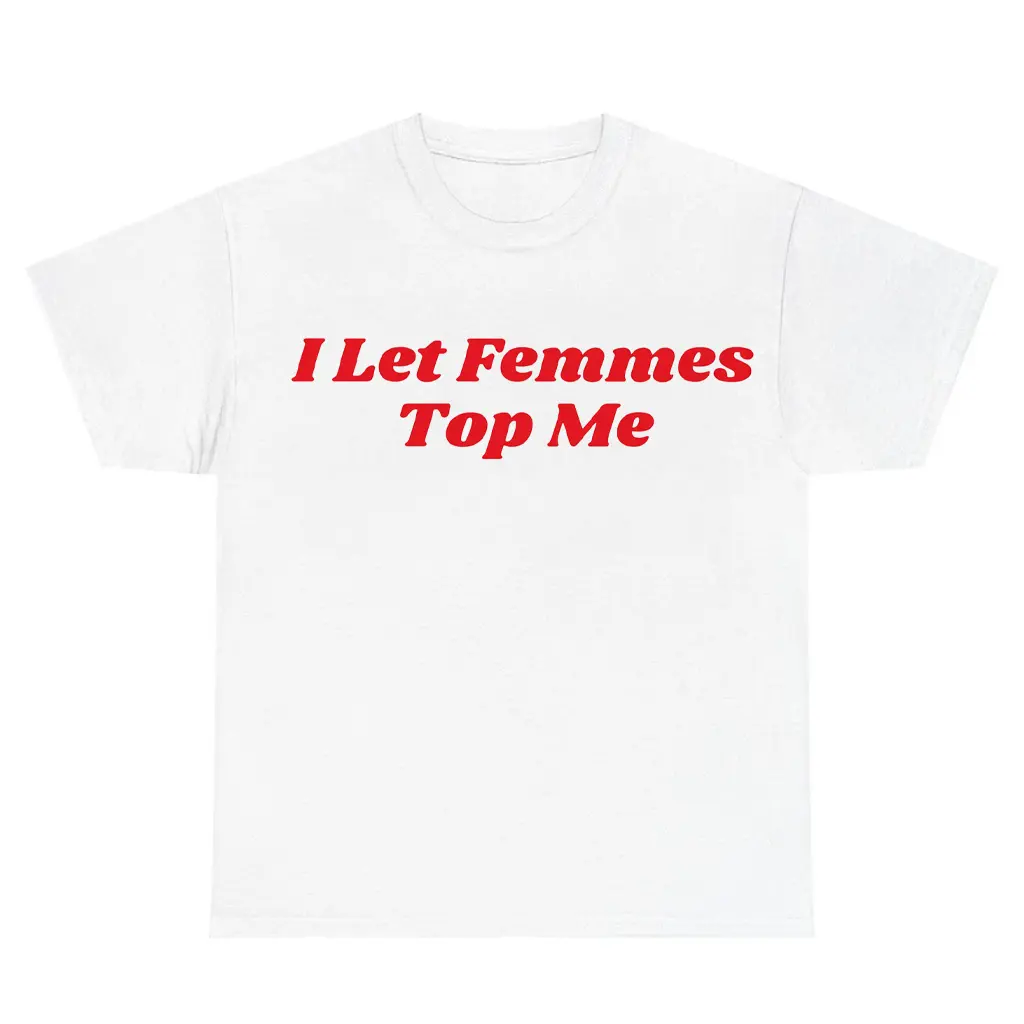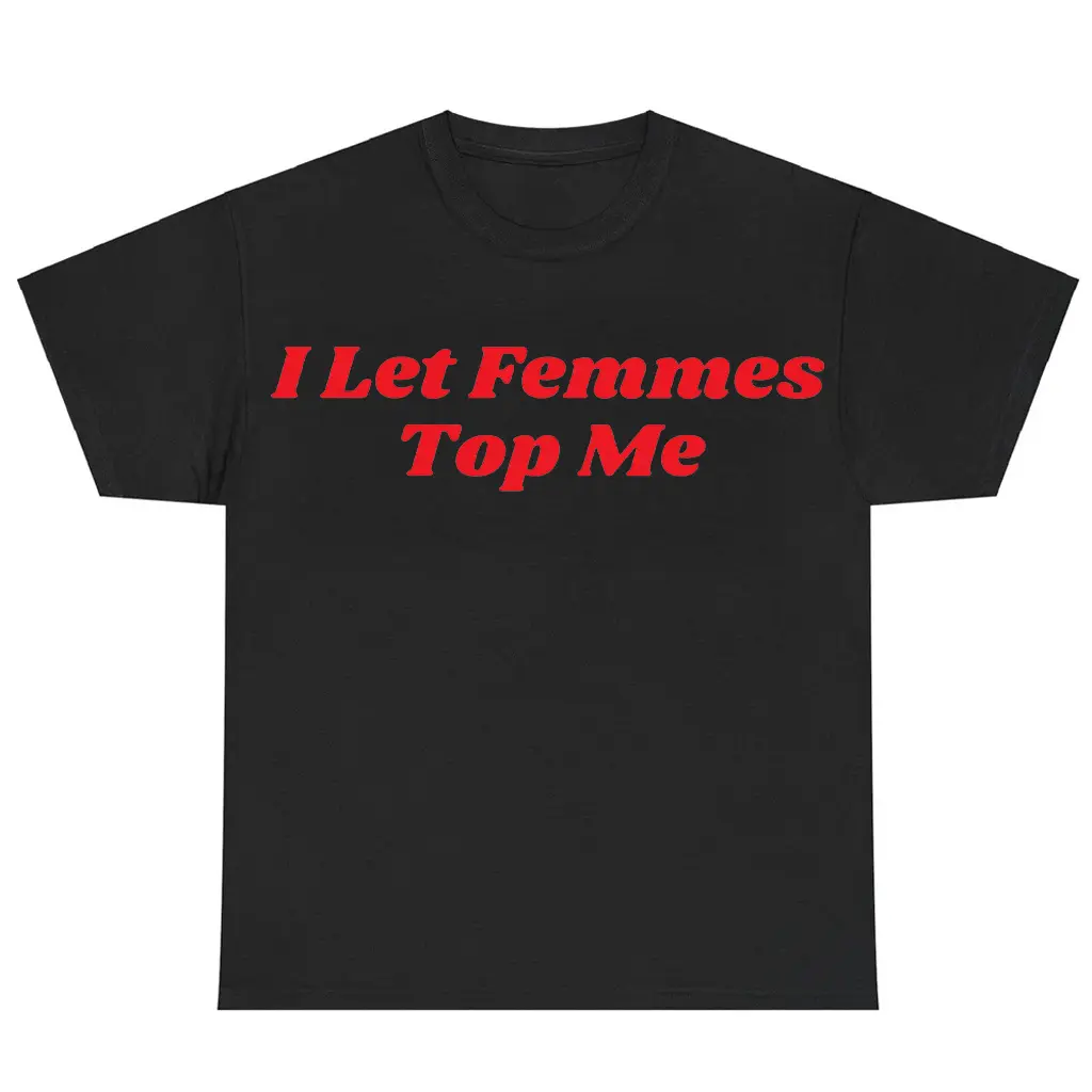 ·🎯 Bold Graphic Design: Eye-catching print with "I Let Femmes Top Me" slogan in vibrant, edgy lettering, surrounded by playful Pride motifs. The humorous twist on lesbian dynamics adds that perfect queer edge, making it a standout piece for Edgy Lesbian Humor lovers. 🌈