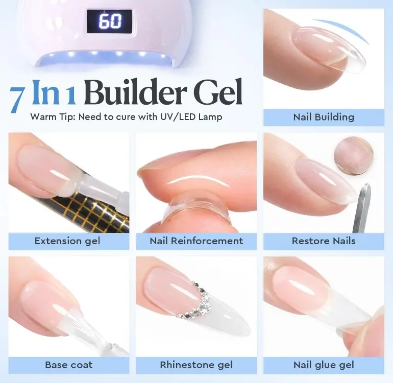 ·【18ML Builder Gel for Nails 】7-in-1 multifunctional builder gel supports nail thickening, apex building, extension repair, false nail bonding and rhinestone decoration, also works as reliable rubber base gel. Extra large 18ml capacity offers high cost performance than regular nail gel