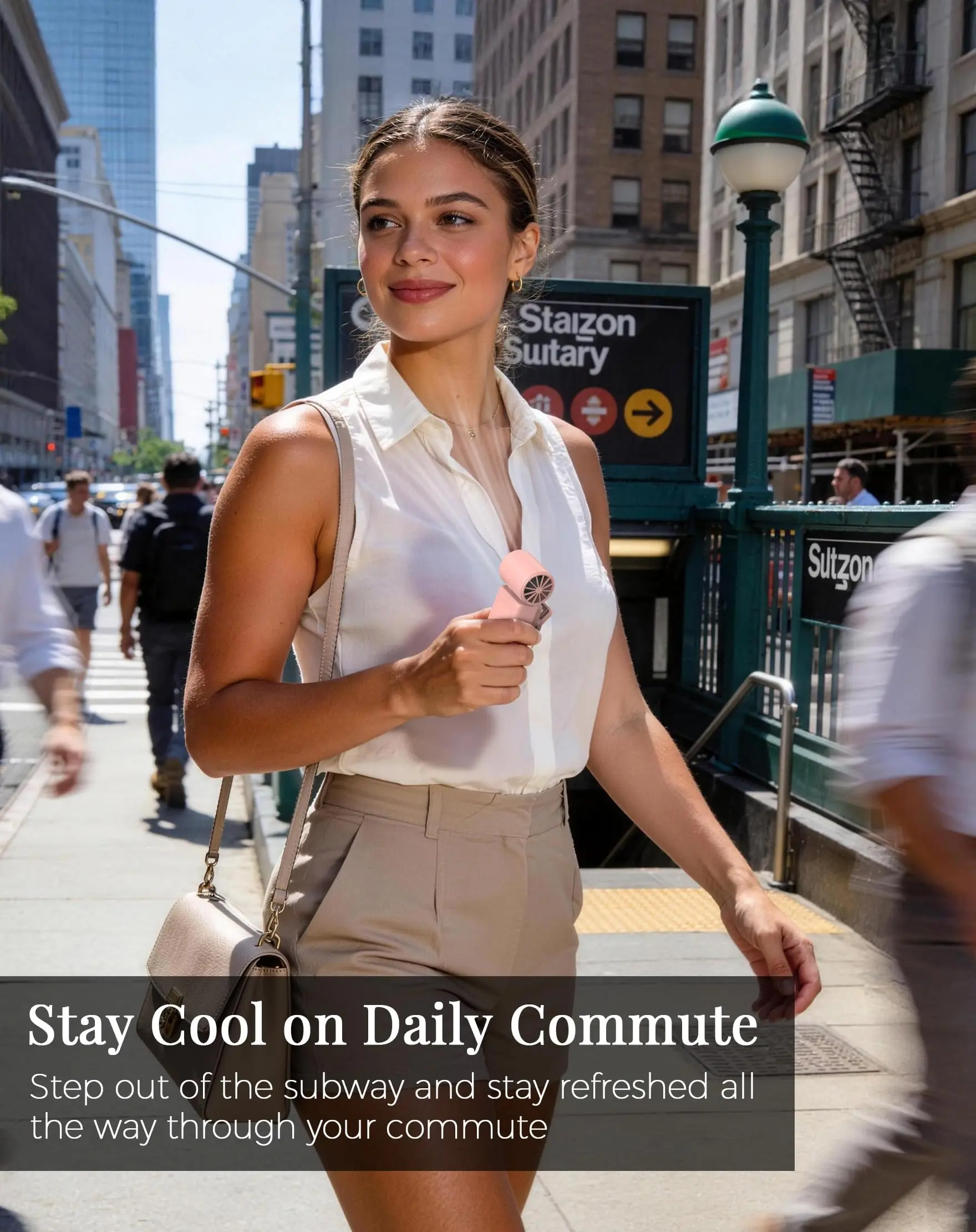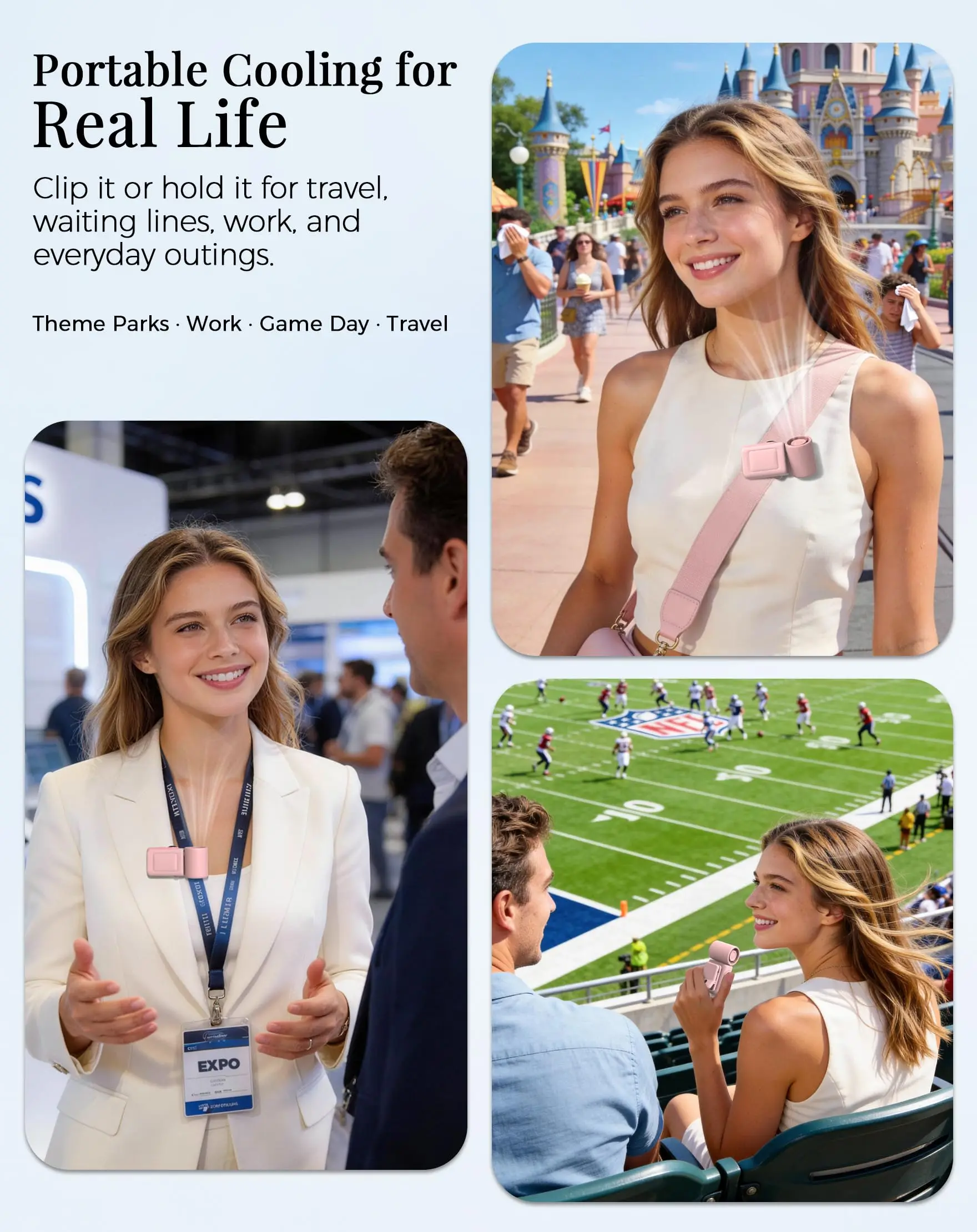 Powered by a 13500 RPM high-speed motor, this rechargeable fan delivers strong, steady airflow. Compact and easy to carry, it fits in a purse, tote, diaper bag, or travel bag. Ideal for daily errands, city walks, theme park lines, road trips, vacations, and outdoor events. Quick cooling for real-life summer use, travel days, and busy warm-weather outings.