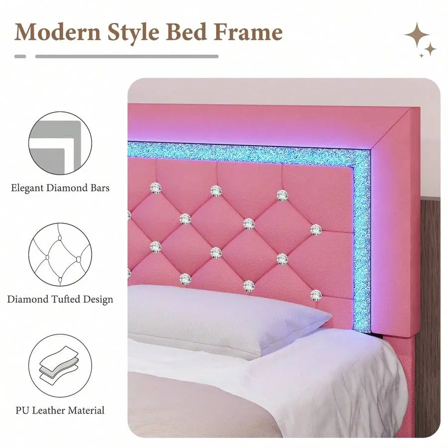 [Smart LED Lights]The LED light strip is set into the bed's headboard of our Upholstered bed frame, and the diamonds reflect differently brilliance under the light. You can adjust the light by using the remote control or mobile app to create a comfortable and cozy sleeping environment.