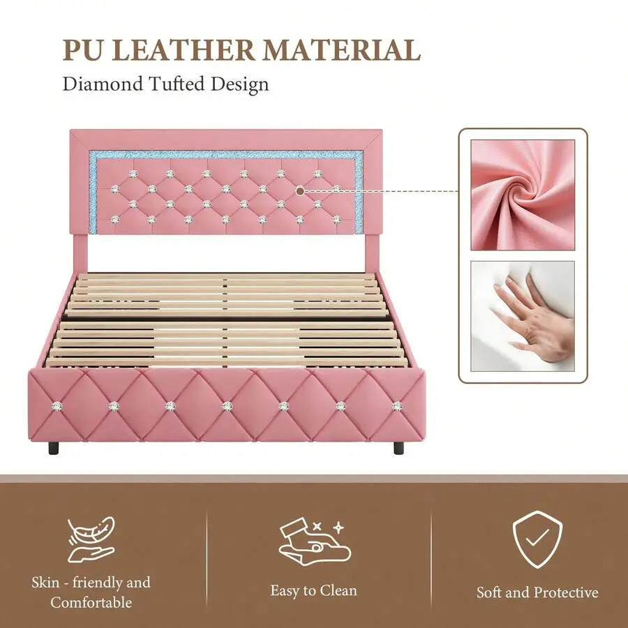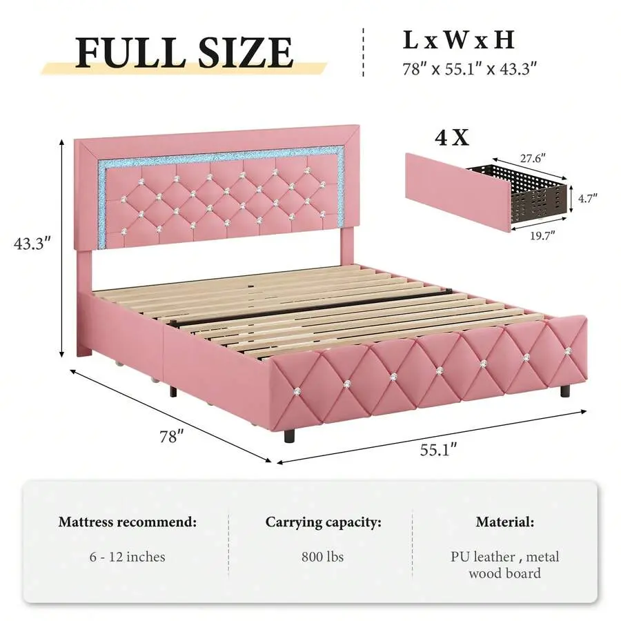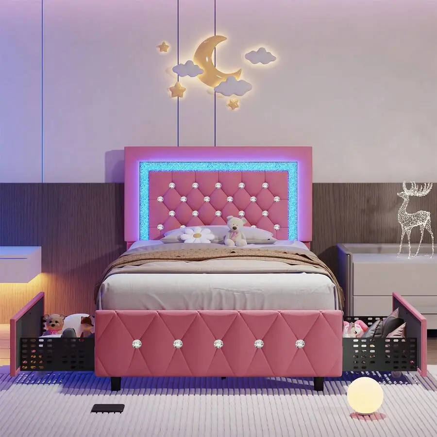 [4 Large Storage Drawers]Our LED bed frame with storage has 4 large storage drawers under the bed, which can offer ample place to store bed sheets, off-season clothing, toys, and sundries. And our drawers also have smooth wheels for easy pulling and closing.