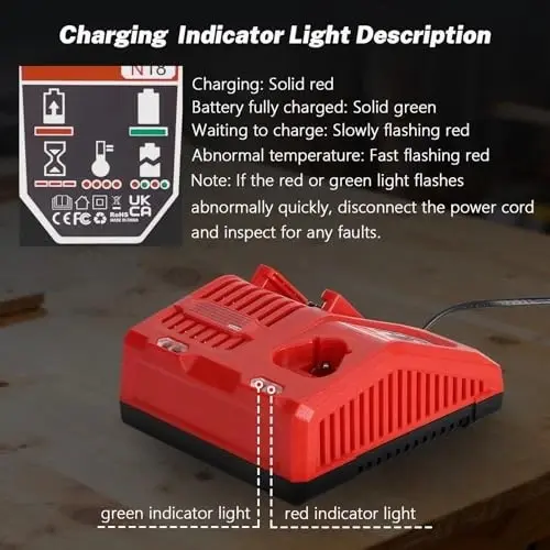 Tools Charger Intuitive Led Status Tracking – Know Your Battery State: Red Steady = Charging; Green Steady = Fully Charged; Red Slow Flash = Waiting; Red Fast Flash = Error (Unplug Immediately); Red+Green Fast Flash = Battery Issue (Check Before Reuse).