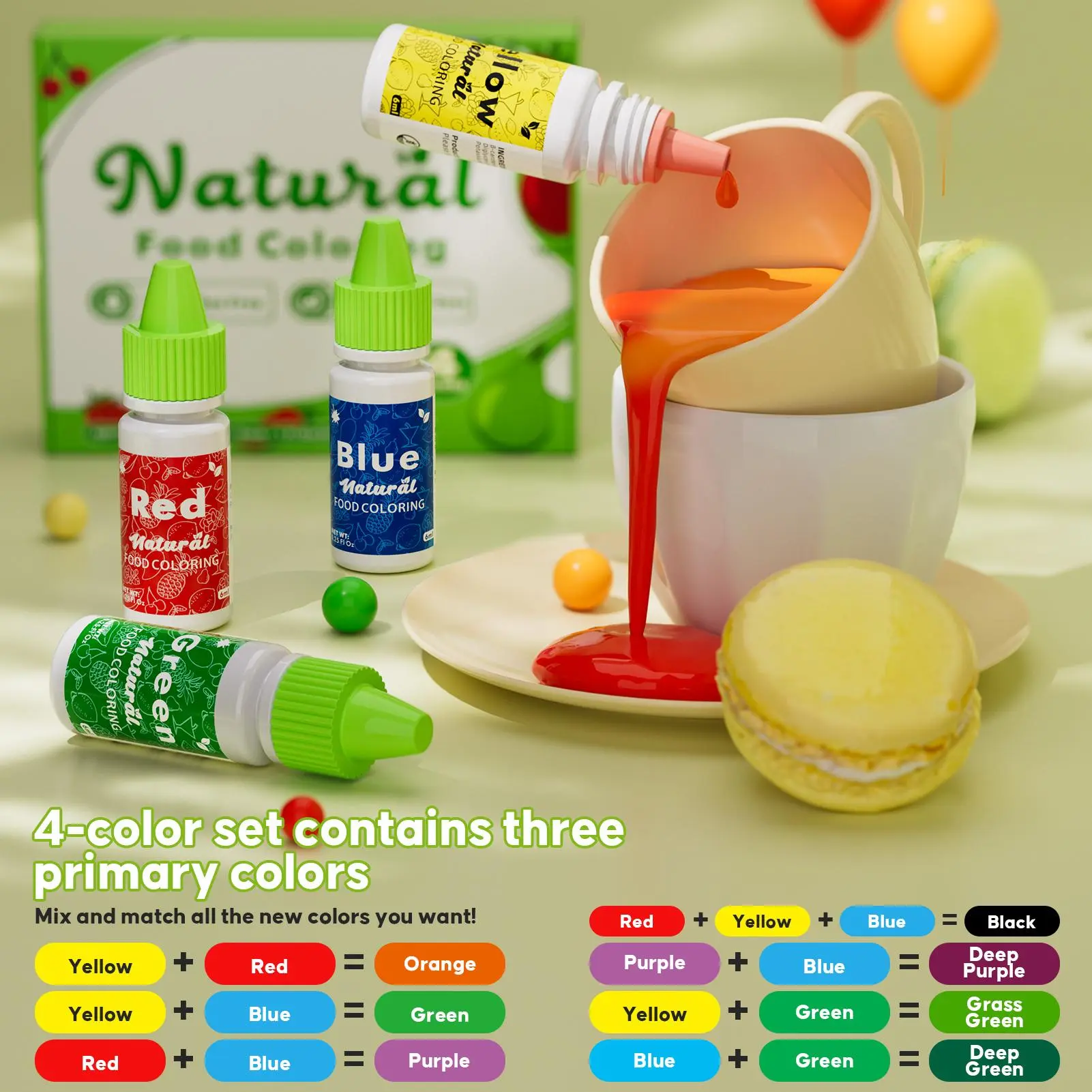4 Core Colors & Custom Mixing: Includes Red, Yellow, Green, and Blue—essential shades of vegan food coloring. Easily mix to create custom tones, ideal food coloring for cake, frosting, fondant, and Easter baking projects.