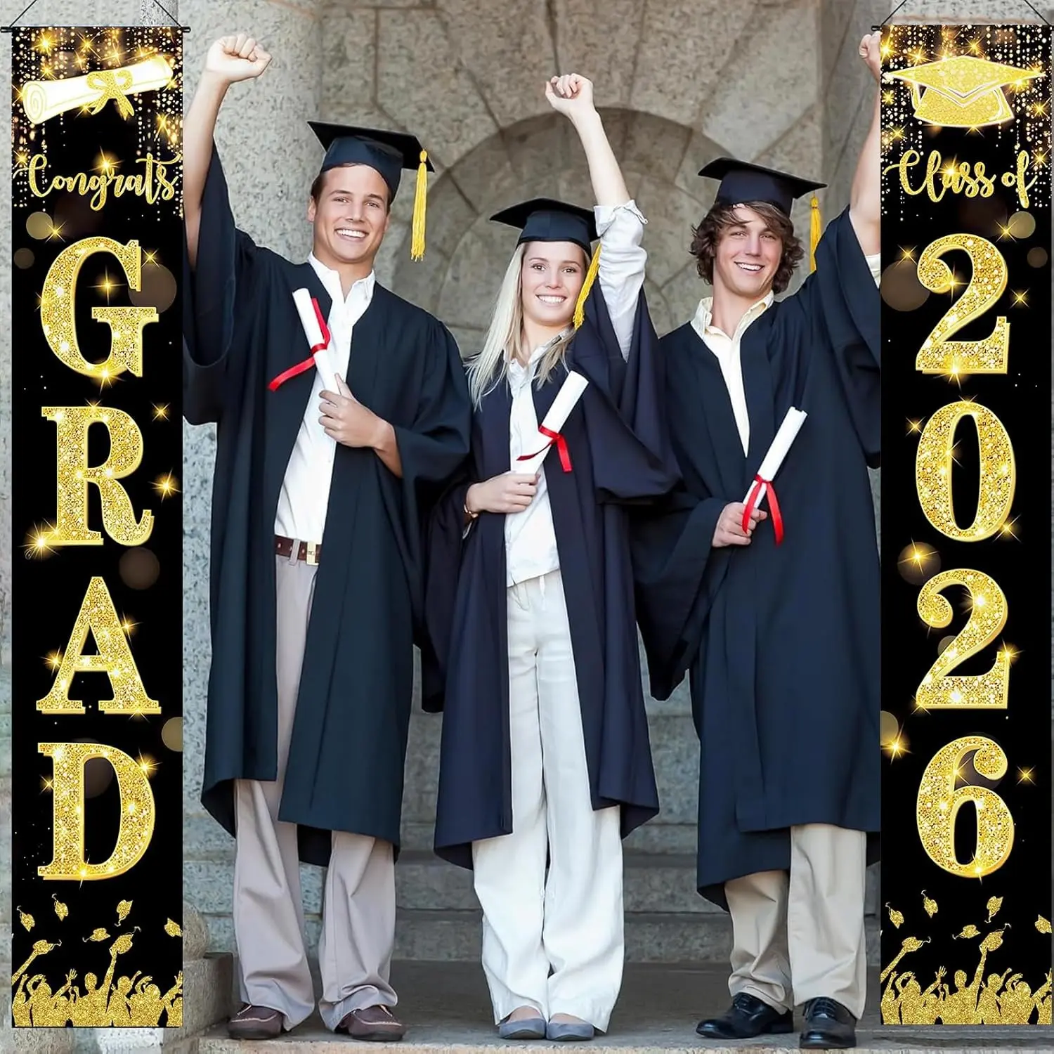 ·【Eye-Catching Design, Perfect Photo Backdrop】 The unique black and gold glitter design, combined with vivid graduation cap, diploma, and cheering crowd silhouette patterns, creates a luxurious and vibrant visual effect. Whether used as a welcoming decoration for a graduation party or as a backdrop for graduation photos, it will undoubtedly attract attention, leaving unforgettable and brilliant moments for your graduation celebration, making your photos stand out on social media.