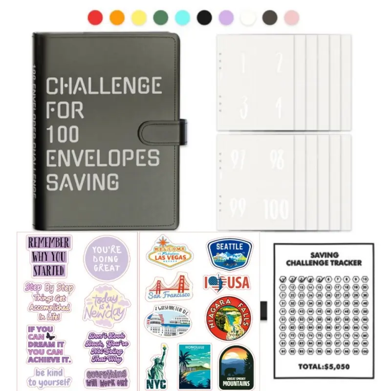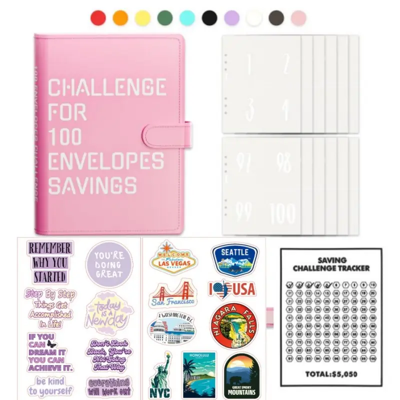 Thick PU leather binder, scratch-resistant. 25 filler pages with 4 pockets each. Clear PVC envelopes are waterproof and tear-proof. Ensure the safety of your money. Stay organized and manage your savings challenge effectively.