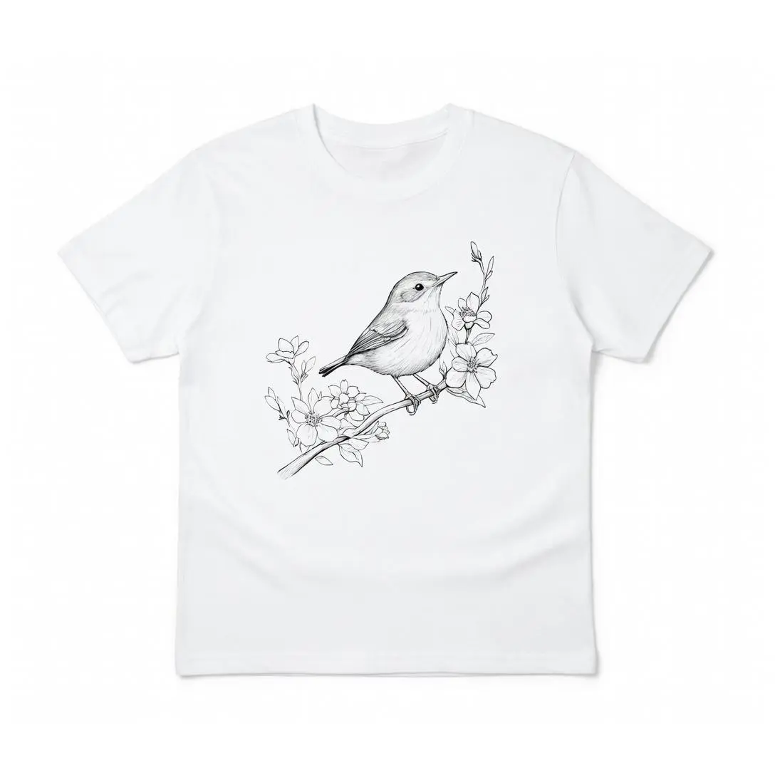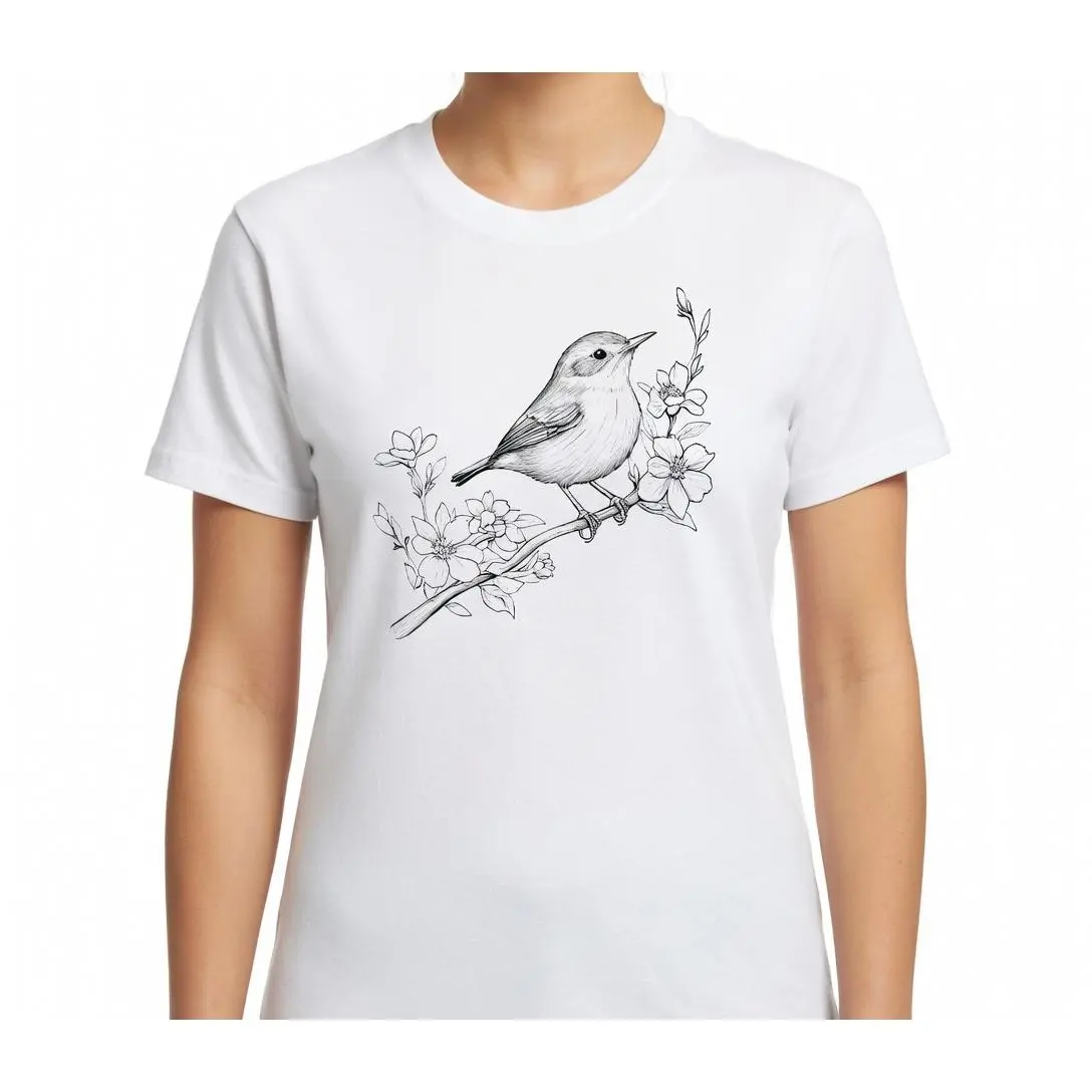 Botanical Bird Graphic Tee for Nature Lovers Vintage Illustration Top Wildflower & Songbird Apparel for Ornithology Enthusiasts Comfy Fitted Short Sleeve Crew Neck Summer T-Shirt - Womenswear