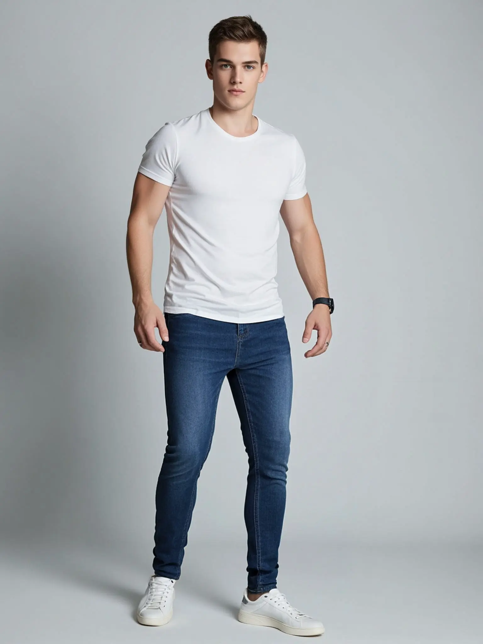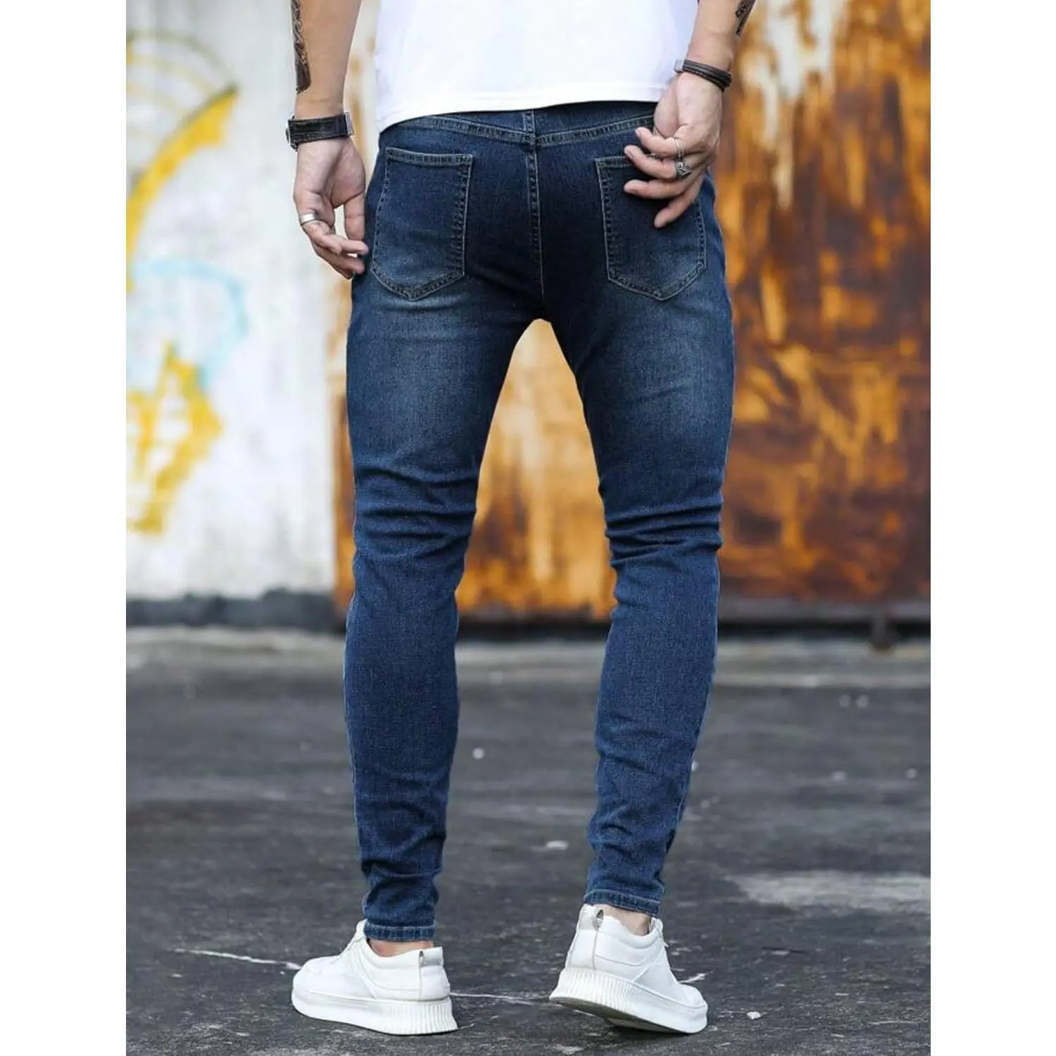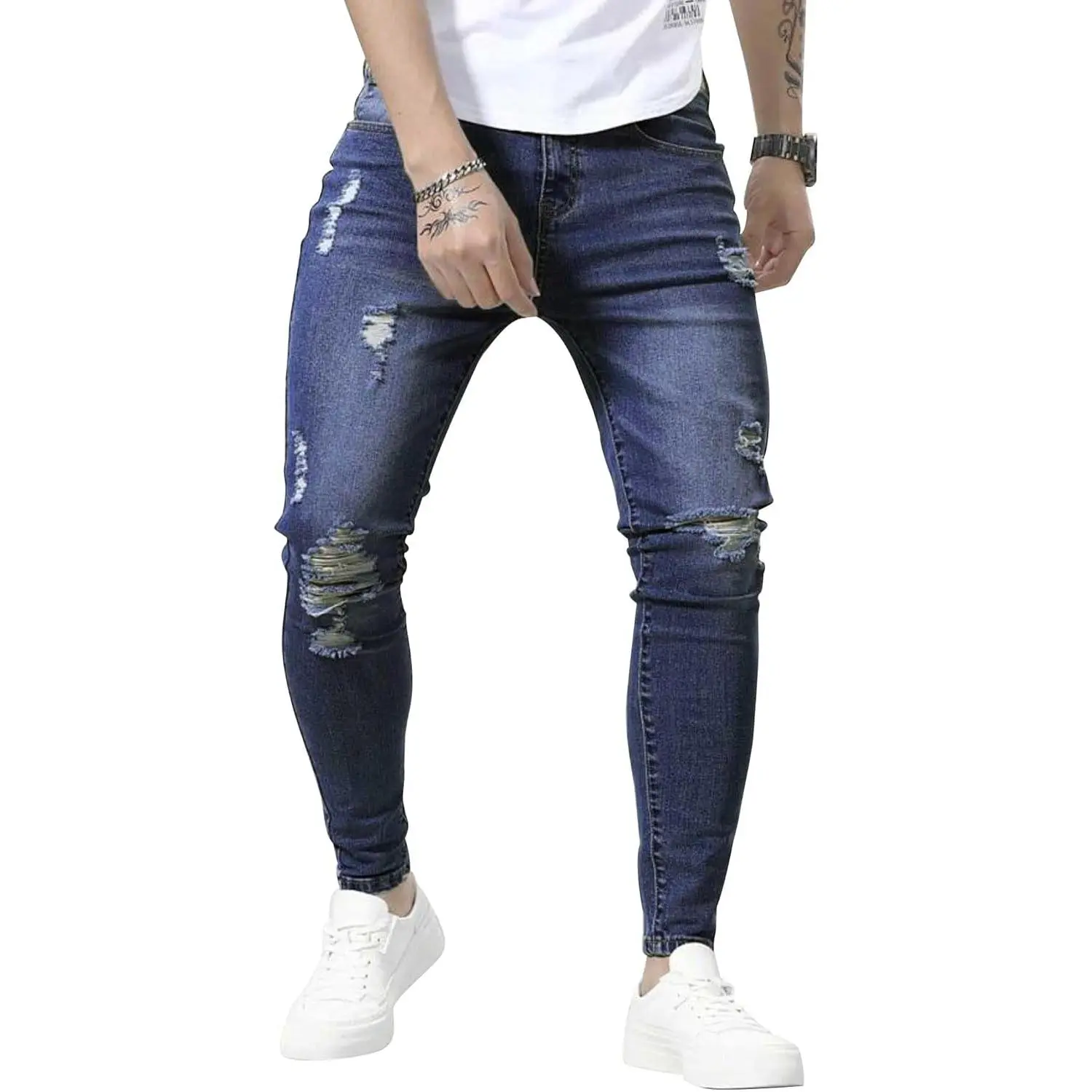 Material: 98% Cotton, 2% Spandex Please refer to the size chart IN THE PICTURE (NOT in the default size chart). Stylish Ripped Jeans with Super soft denim, very comfortable for daily wear. Slim legs, zipper at ankle part, 5 pockets design, distressed destroyed design, white stripes matching Great to match with any blouse tops, T shirts, turtleneck, sweatshirt, jackets, coats and shoes, to give you a handsome and cool look