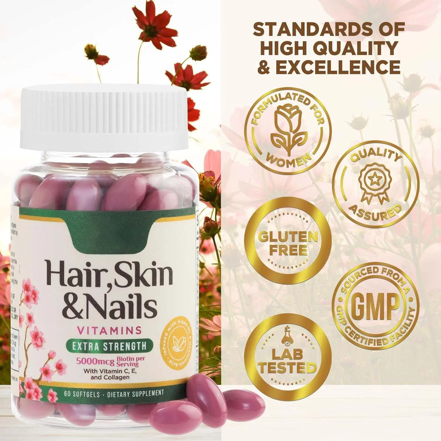 Discover the power of Biotin 5000mcg per serving! This extra strength supplement is designed for women seeking hair growth support. It includes Collagen and Argan Oil for beautiful skin, hair, and nails. Each bottle contains 60 softgels, ensuring a convenient daily dose. Perfect for those looking to enhance their beauty routine naturally.