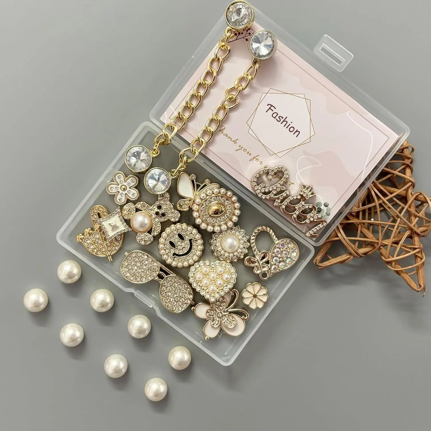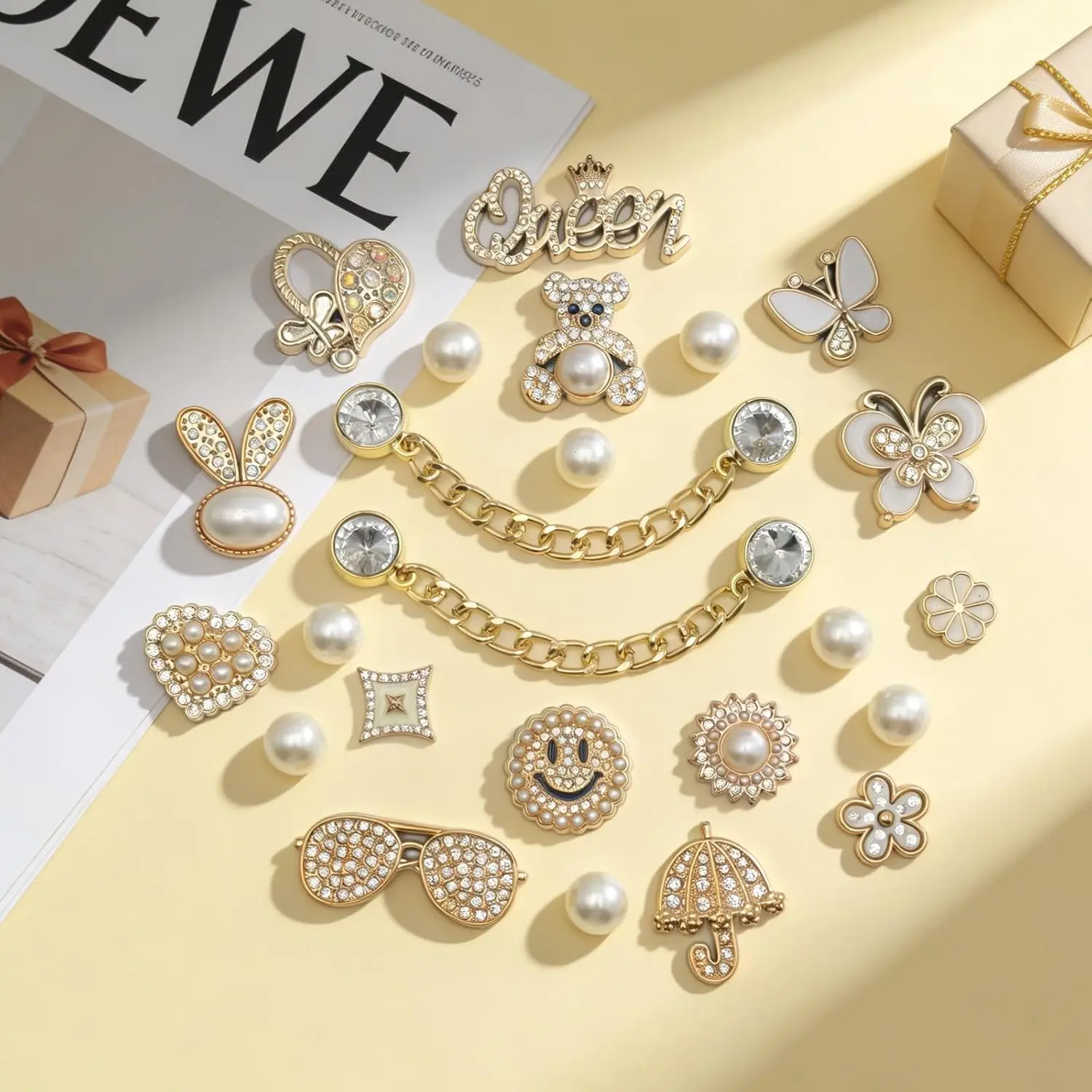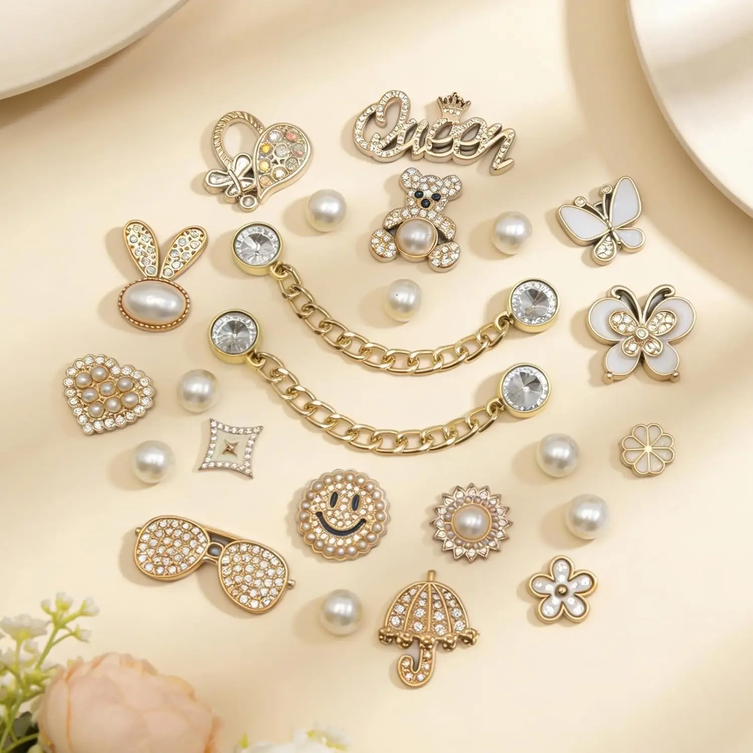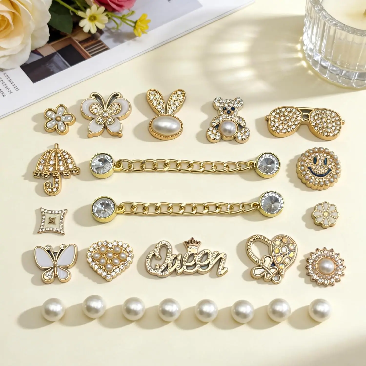 ·Package List- This golden charms set contains a pair of shoe chains with bling rhinestones, 8 pearl accessories and 14 shoe charms with different designs.