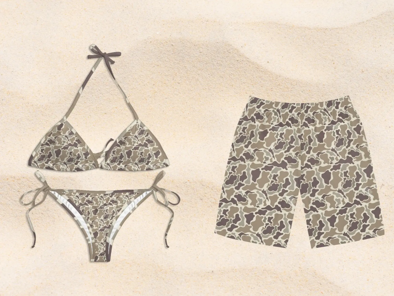 5. Marsh Camo Matching Swimwear Set - Couple Beachwear - Camouflage Bikini for Women and Men's Swim Trunks - Matching Couple Swimsuit - Hunter Style Beach Outfits