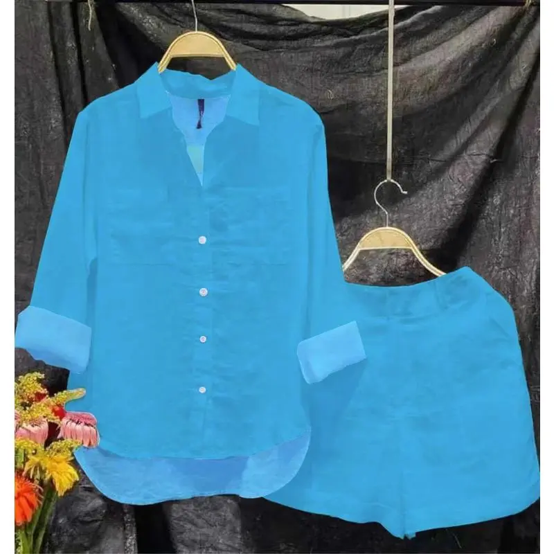 Fashion White Long Sleeve Shirt And Shorts Two Piece Sets Women Cotton Linen Casual Home 2 Piece Set Women