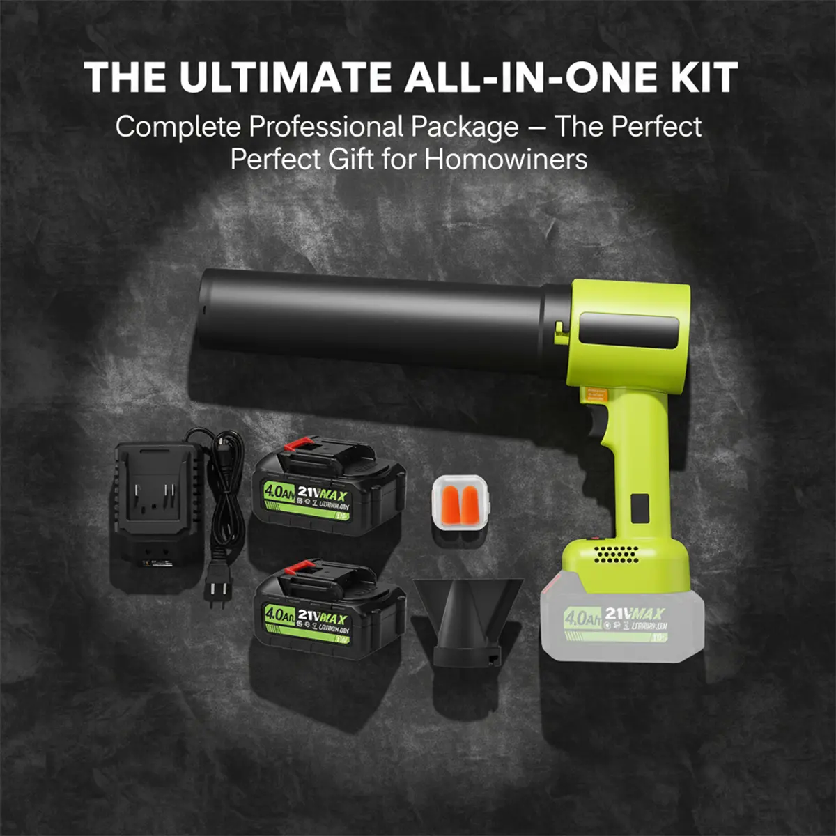 Includes 1 x SakerPlus Handheld Blower Unit, 2 x 21V 3000mAh Rechargeable Lithium Batteries, and 1 x Charger. Note: It produces noticeable noise at high settings. Wear hearing protection for safety.