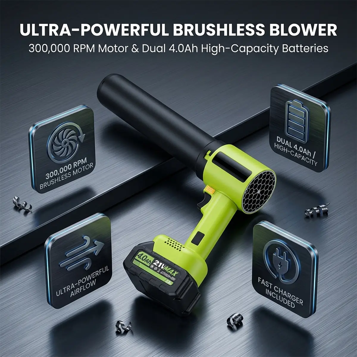 Includes two 4.0Ah lithium-ion batteries and a smart charging dock. The thermal protection system prevents overheating. A full charge in 4 hours provides 8 to 90 minutes runtime. Ideal for uninterrupted cleaning of yards, patios, or vehicles.