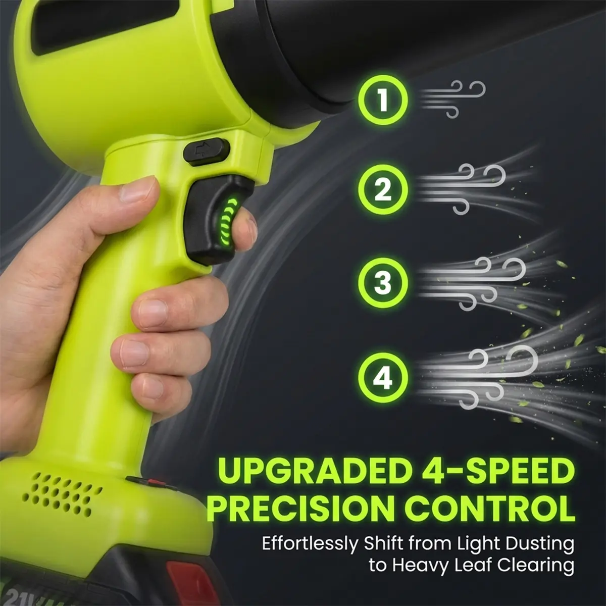 The SakerPlus 21V Cordless Leaf Blower boasts a high-speed motor reaching 300,000 RPM, generating up to 52 meters per second airflow. Its upgraded 4-speed control allows effortless adjustment of wind speed. This ensures energy-efficient operation, perfect for clearing light dust or heavy leaves. Complete tasks with precision and ease.