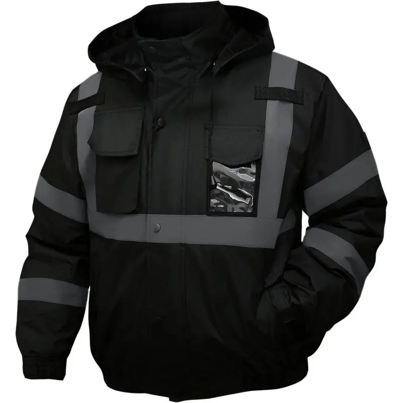 safety jacket for men, Reflective high Visibility Hooded jacket, Hi-Vis Bomber Jacket with Pockets and Zipper, waterproof, Black Bottom, ANSI/ISEA 107-Type R Class 3