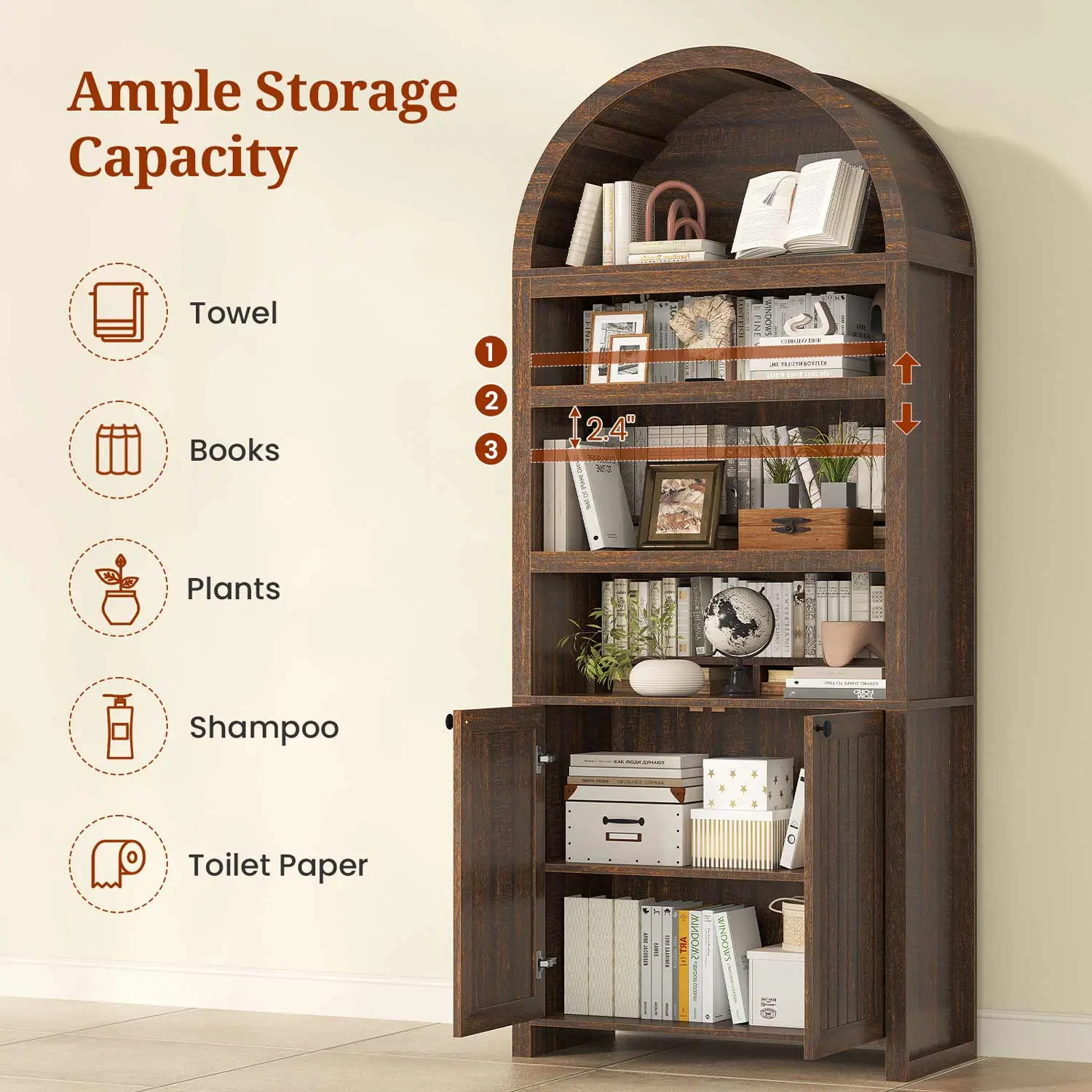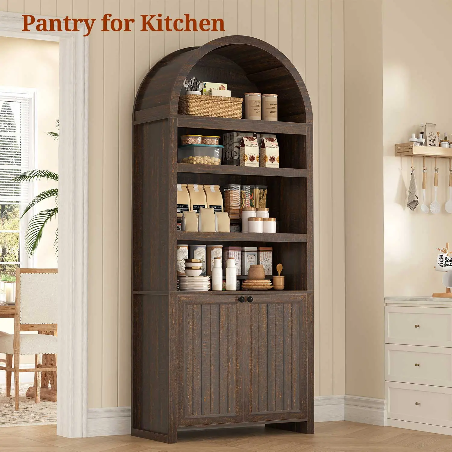 Serve numerous roles throughout your home as a living room library, kitchen pantry organizer, bathroom storage unit, or entryway display piece. Its adaptable design and neutral styling enable seamless integration into diverse environments, effortlessly meeting storage demands across different rooms and lifestyles.
