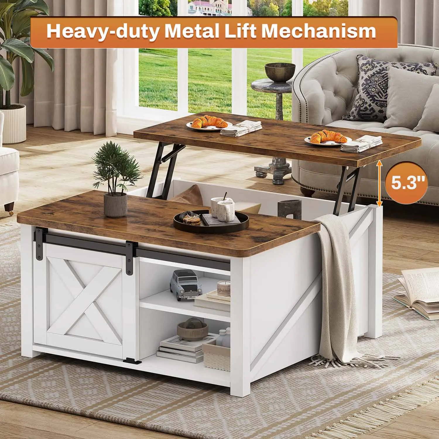 The coffee table experiences smooth and safe lifting with a high-quality lifting mechanism featuring gas struts. Raise the top of this coffee table from 19.7 inches to 25.4 inches and make it easy to work from home, enjoy a meal, do crafts, or play games while sitting comfortably on your couch