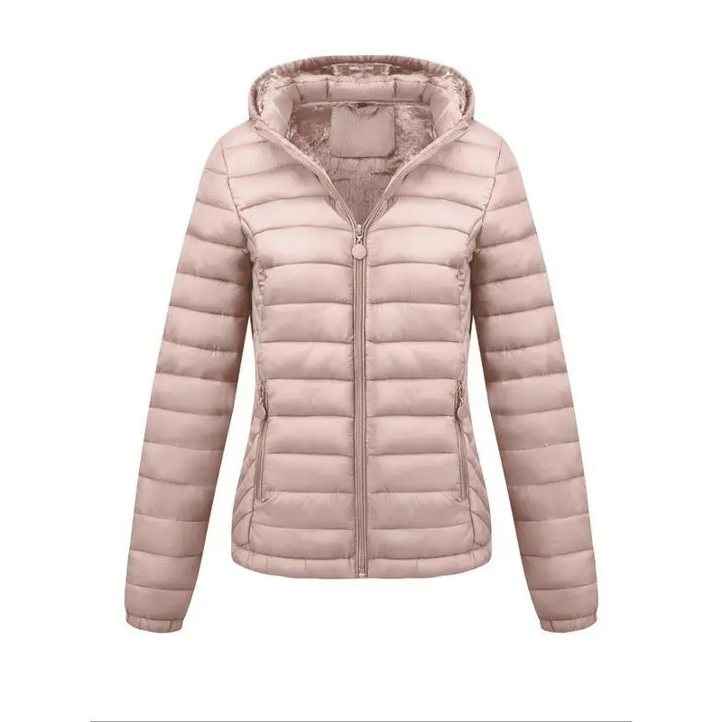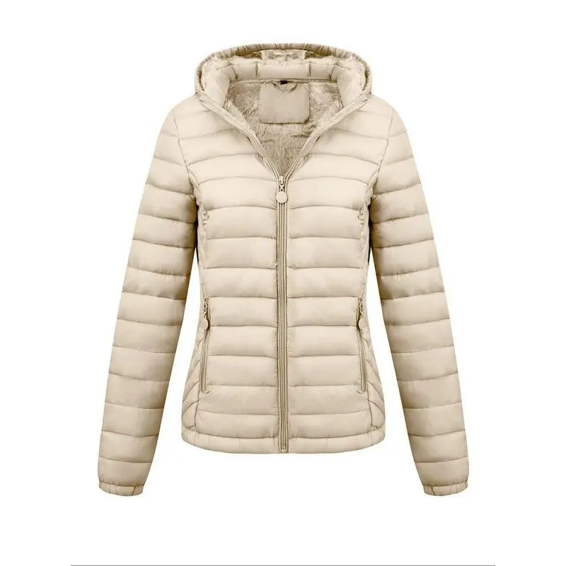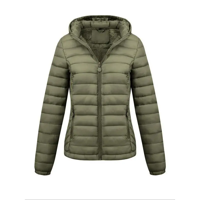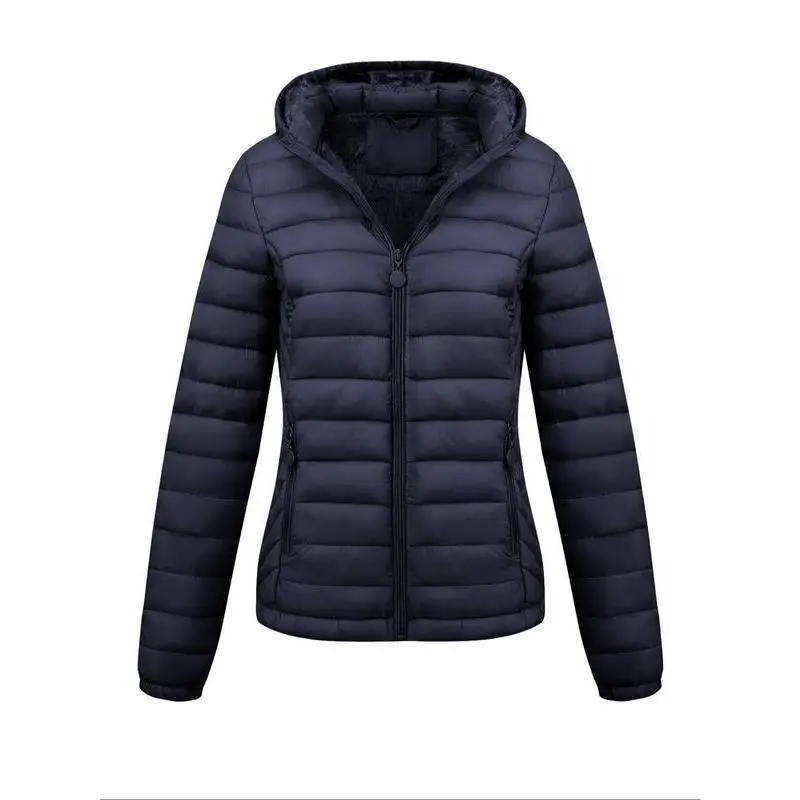 [Fitted silhouette]: Tailored for a flattering shape that emphasizes your figure while providing ease of movement throughout the day. [Thin cotton fabric]: Constructed from lightweight cotton, offering warmth without the bulk, ideal for fall and winter seasons. [Practical pockets]: Includes convenient pockets that provide storage for like your phone or keys while maintaining a sleek appearance. [Hooded feature]: Designed with a hood that adds extra warmth and protection against chilly breezes during your daily commute. [Plain pattern]: Features a simple, plain pattern that offers a classic look, making it easy to pair with different outfits.