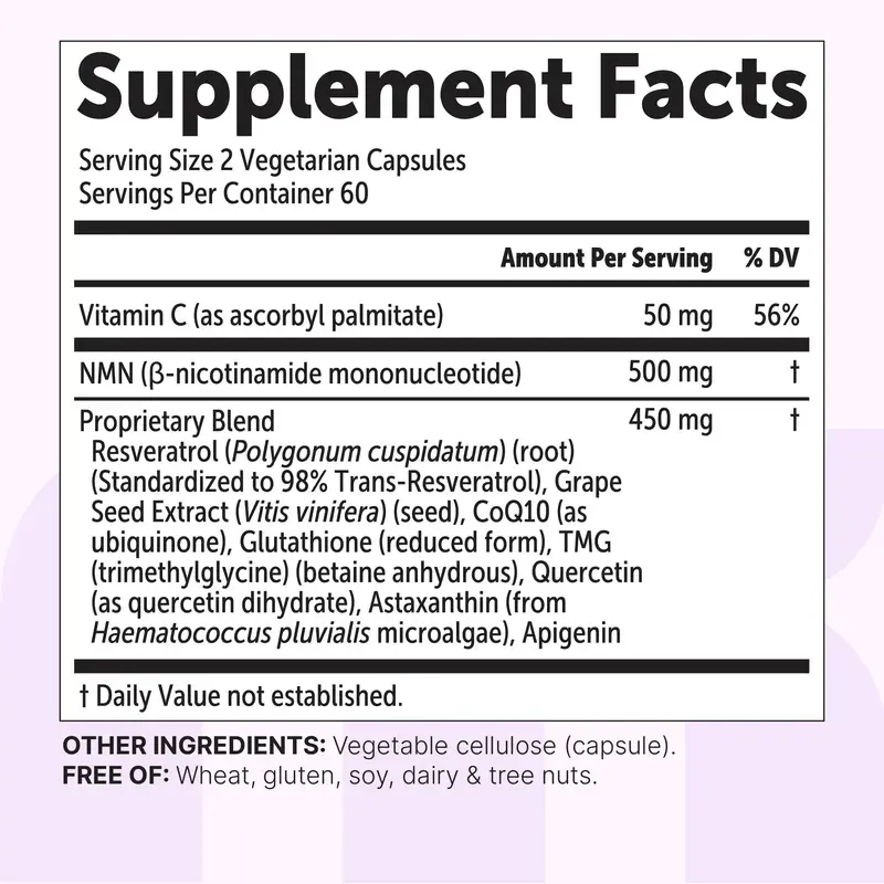 ·Premium non-GMO NMN supplements. Made in cGMP compliant facility without fillers, soy, dairy, gluten, wheat, and tree nuts.