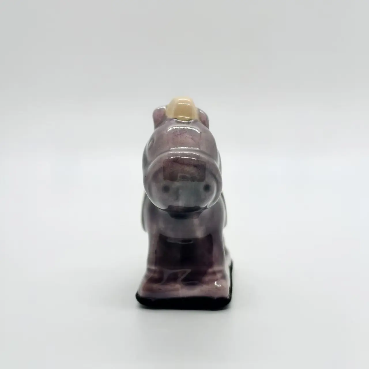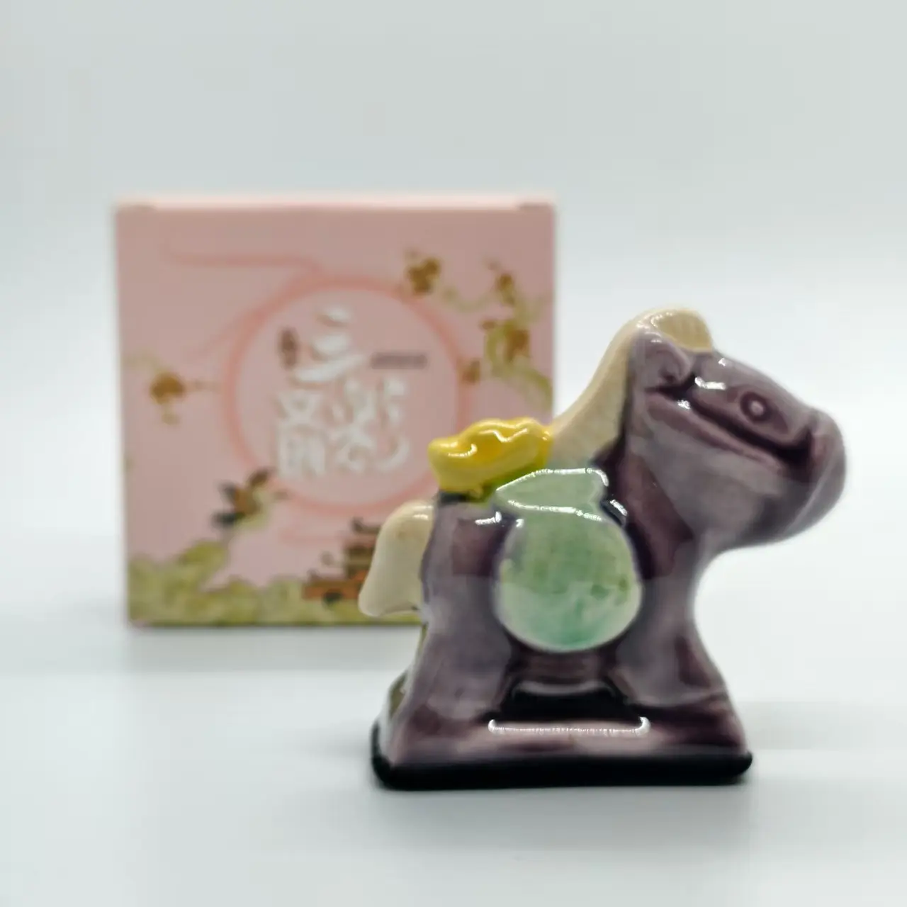 Features: Hand-colored with traditional Sancai craft— the main purple glaze is warm & glossy, with light white glaze on the mane, and yellow ingot + green coin-bag decorations on the saddle (representing the Eastern blessing “fortune on the horse”). Fired in a 1250℃ wood kiln, it has a smooth glaze and a compact shape perfect for tabletop display.