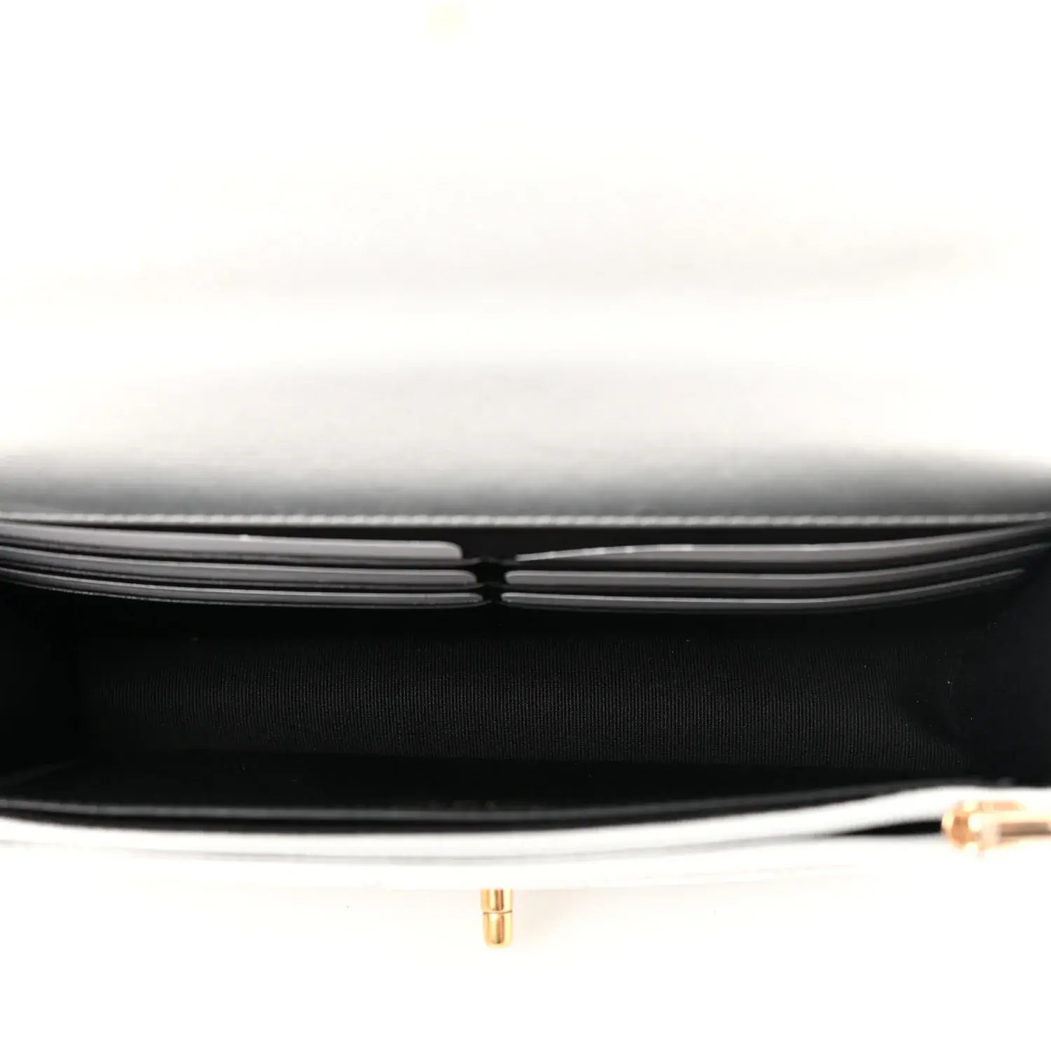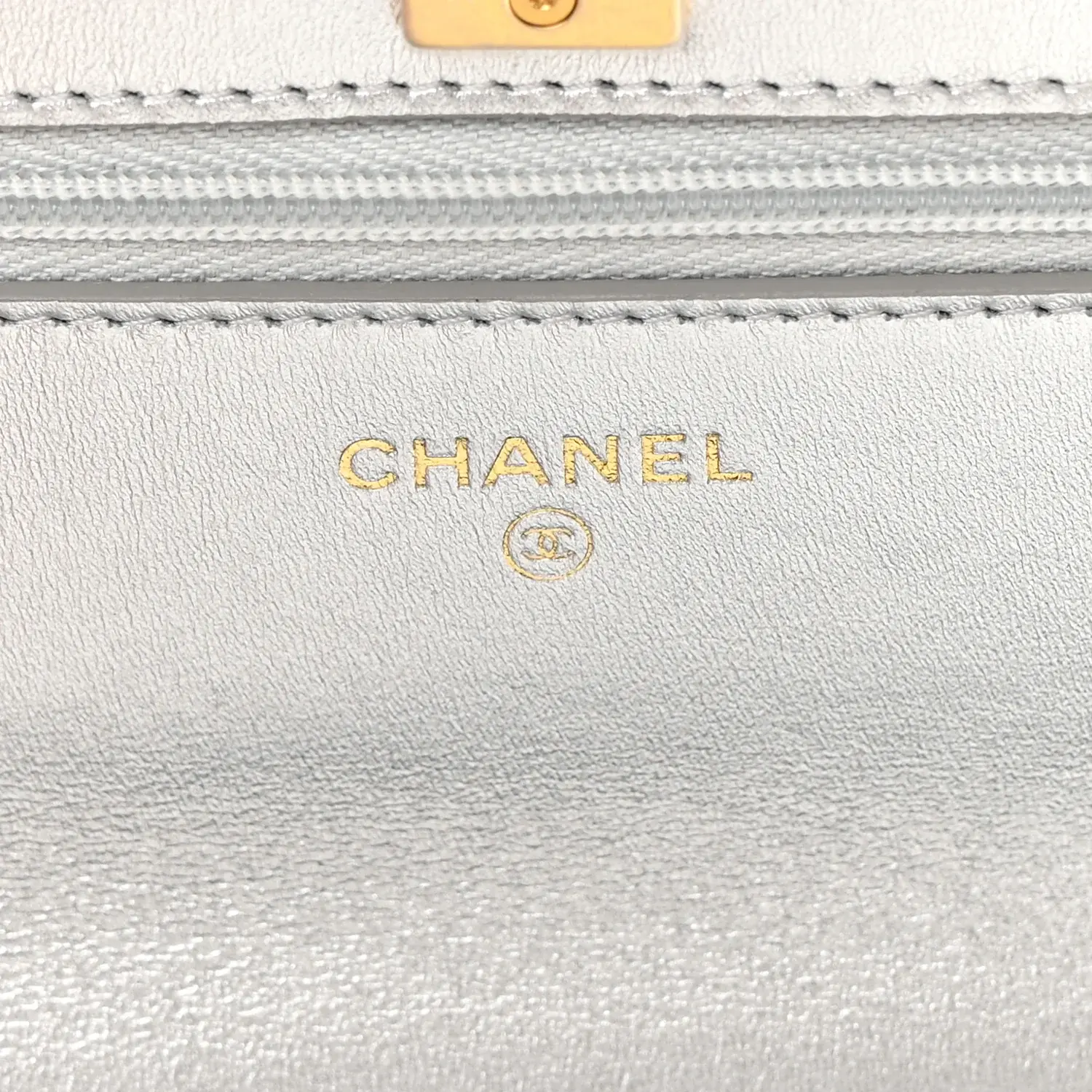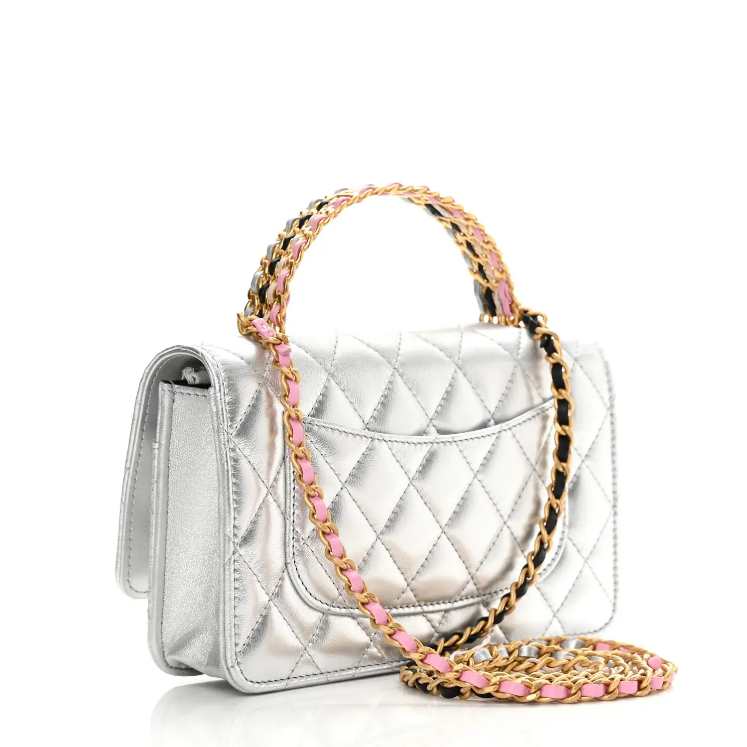 This is an authentic CHANEL Metallic Calfskin Quilted Top Handle Wallet On Chain WOC in Silver. This stylish bag is crafted of luxuriously soft diamond quilted calfskin leather in silver. The bag features a gold chain leather threaded top handle and shoulder strap with a facing flap with a gold Chanel CC logo turn lock. The flap opens to a matching leather interior and patch pocket.