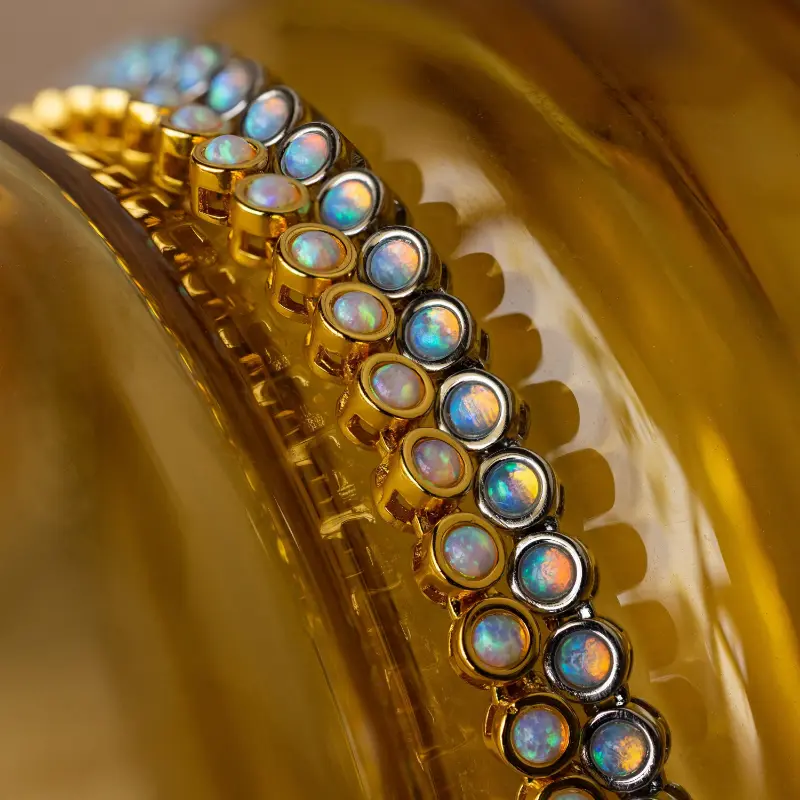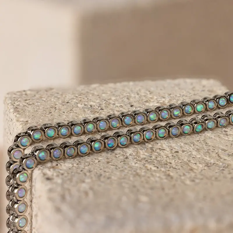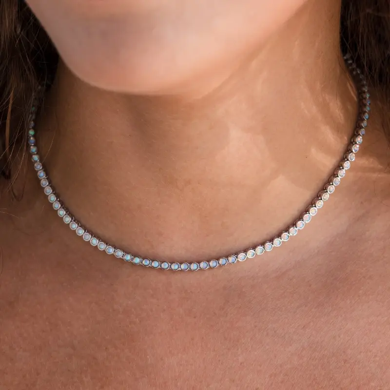 Our Opal Bezel Tennis Necklace features round opal gemstones set in sleek bezels. This exquisite piece combines the elegance of the classic tennis necklace with the iridescent charm of opals, making it a unique and stylish addition to any jewelry collection.