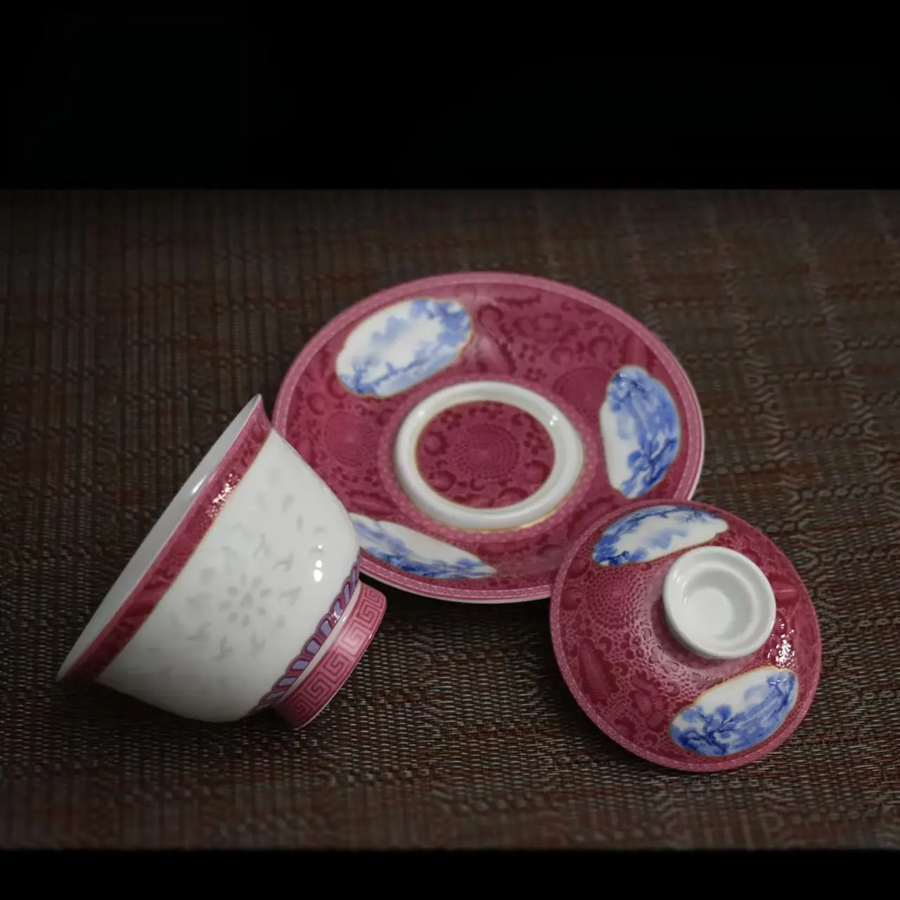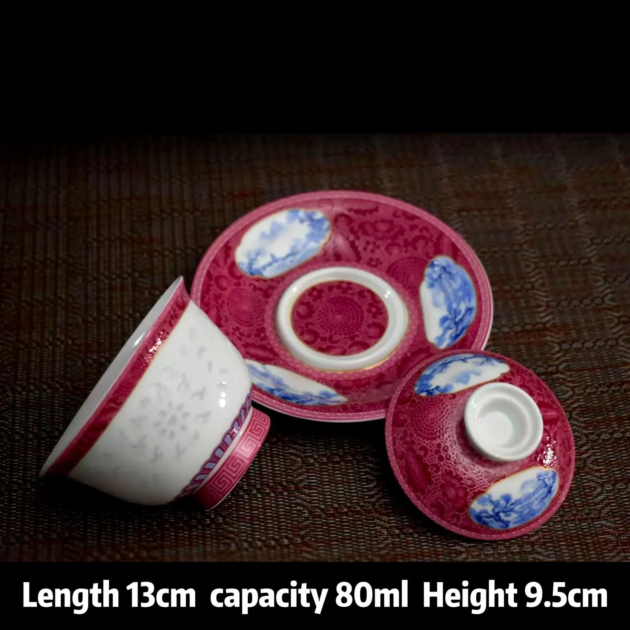 Following the "Three-Talents" philosophy (lid = heaven, saucer = earth, bowl = human), it carries the Eastern ideal of "harmony between heaven, earth and humanity" while offering practicality: the wide rim prevents scalding during pouring, and the capacity is ideal for 1-2 people enjoying gongfu tea (perfect for black, green, or oolong tea). The crimson red glaze retains its rich color without fading after high-temperature firing; the blue & white landscape patterns are hand-drawn by artisans, with vivid, delicate details. The Water-Linglong porcelain body is translucent yet durable, resistant to daily wear; the glaze is treated to repel tea stains—simply wipe it clean with a soft cloth after use to keep it pristine.