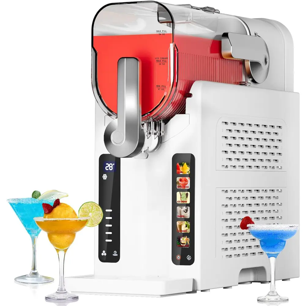 ·No Ice Required, Rapid Freeze Performance – Powered by a high-efficiency compressor and quick-freeze system, this machine transforms juice, soda, coffee, or mixed drinks into smooth frozen textures in minutes without pre-cooling or ice.