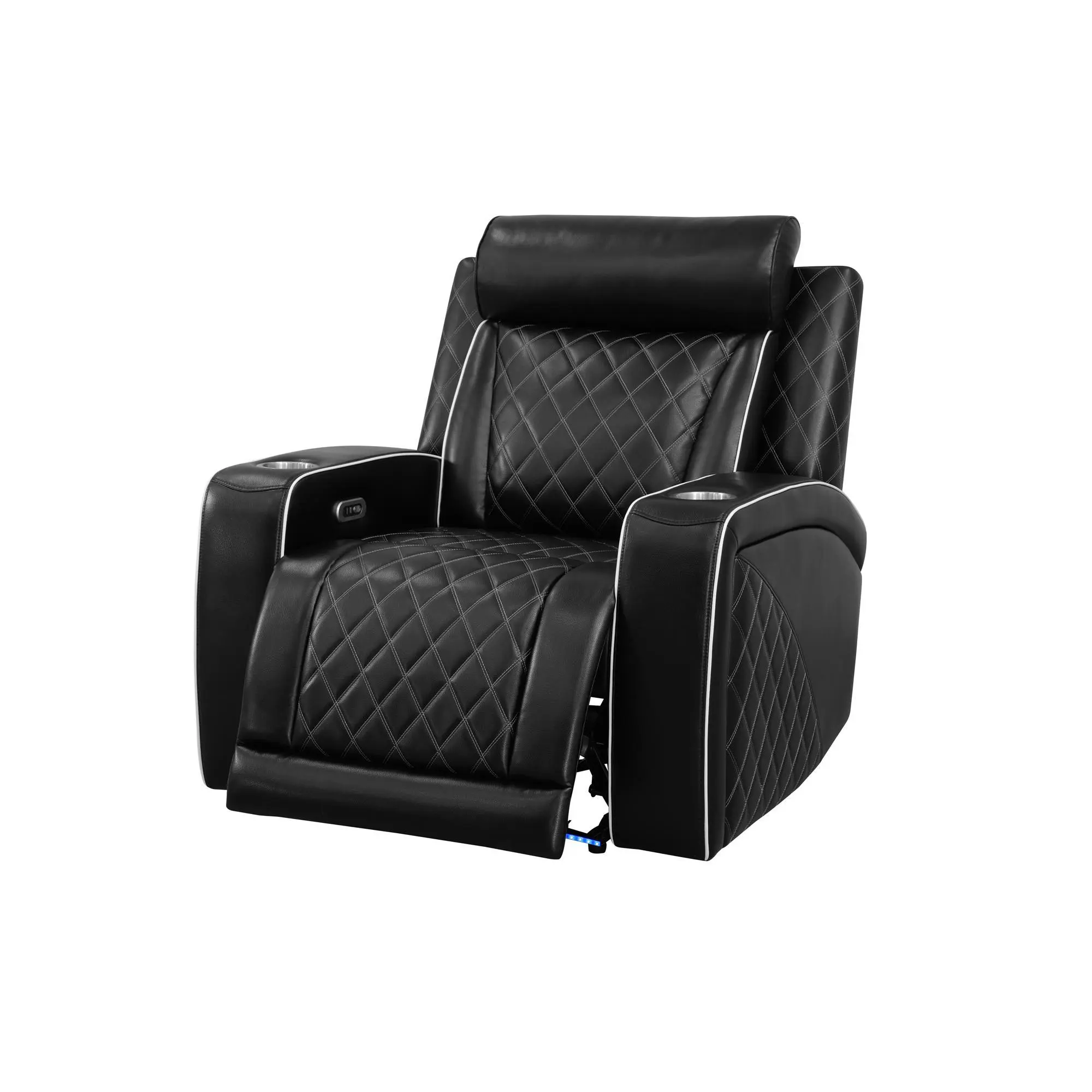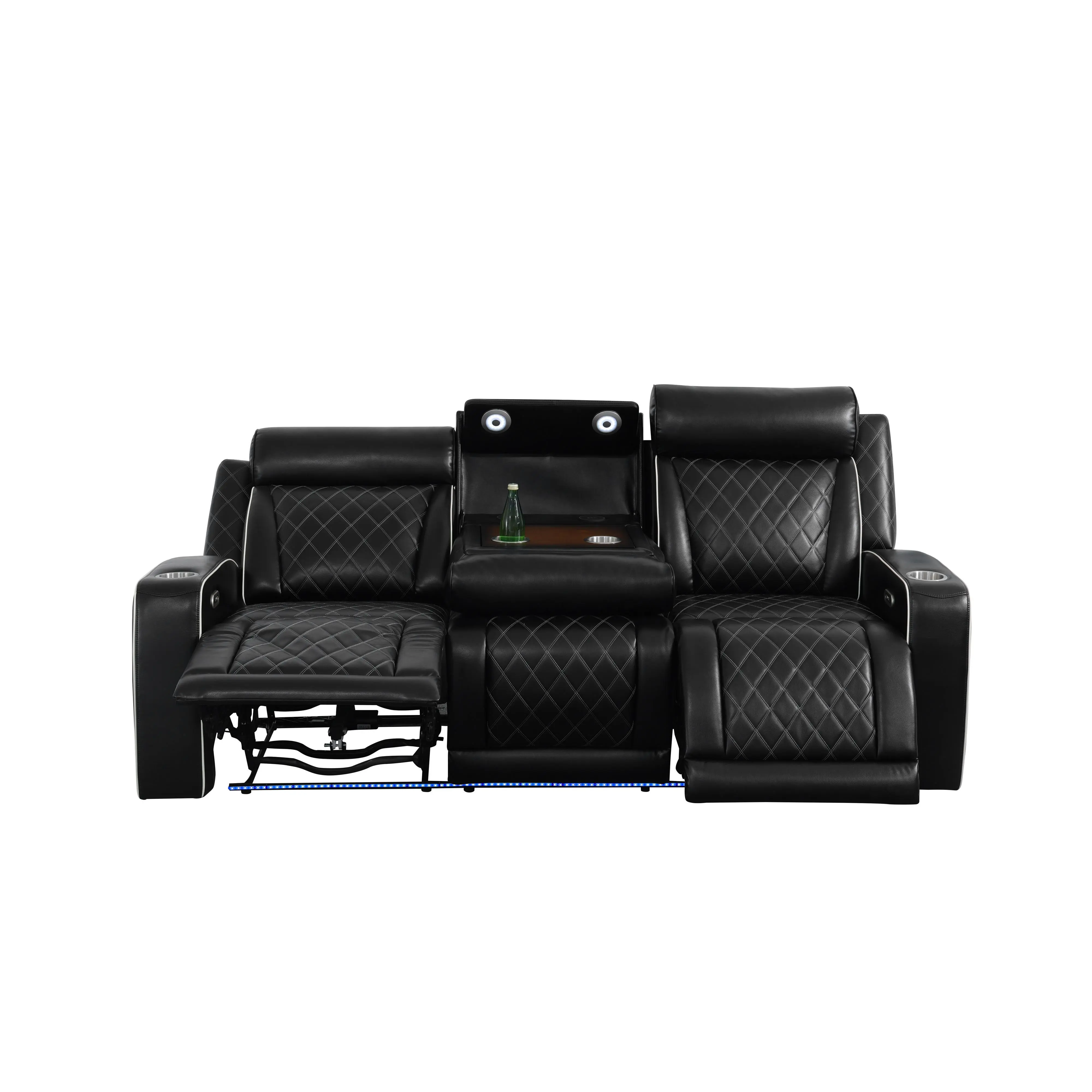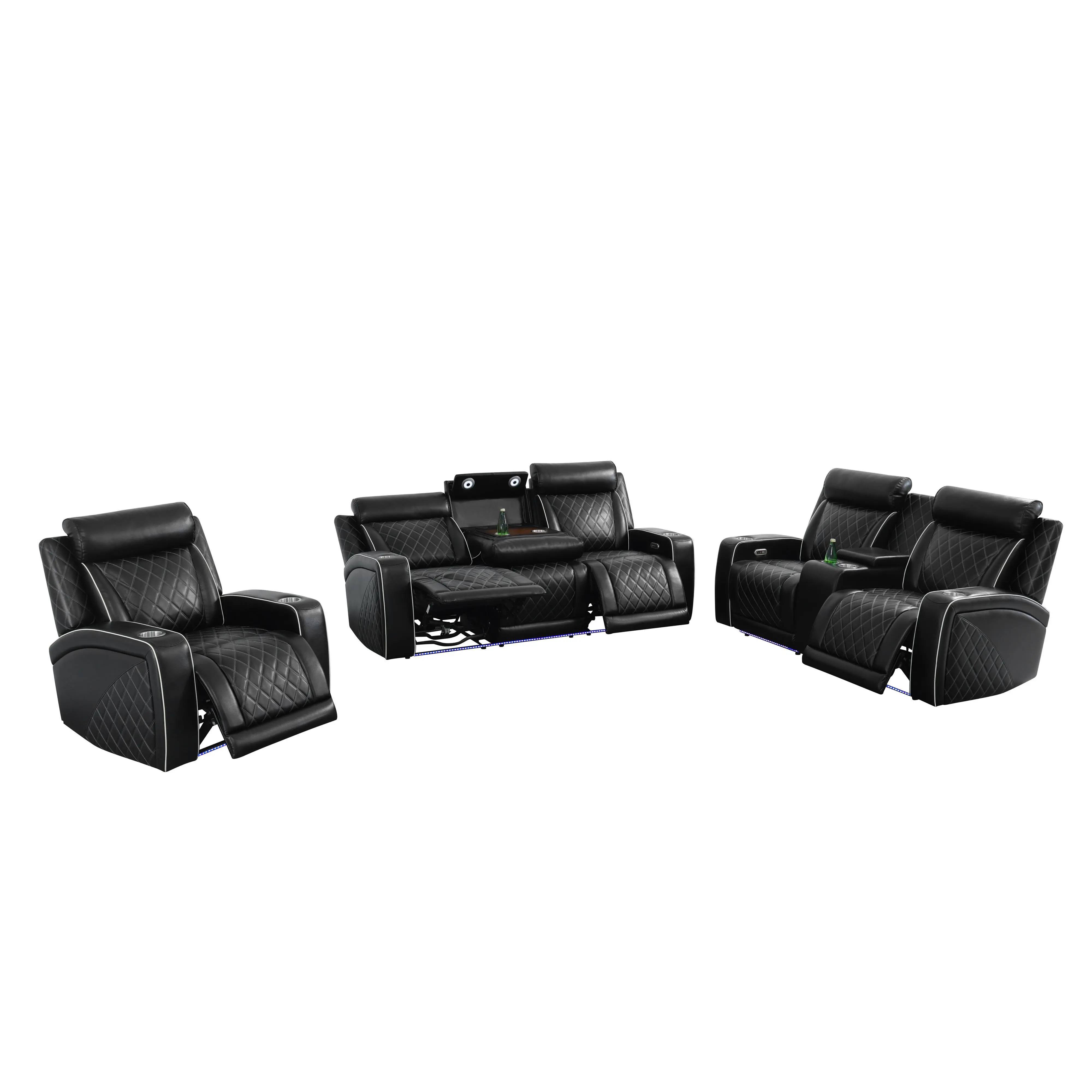 Multi-functional sofa set, this product (Black) can tilt back to the scale of 110-115degree,which is beneficial to human waist and very comfortable.Simultaneously, ourproduct can tilt back when you want to lie down and sleep.you can adjust to a suitabledegree with touching the switch .The single chair has cup-holder whose bottom shape ishexagon geometry lying on its armrest,which is high-end, generous and harmony.Themiddle region of loveseat has a storage bucket,which can store small items for dailyuse.The region also has cup-holder to settle beverage and cup,which is practical andconvenient.The middle part of S marked sofa has flipping cup-holder board, while flip itupwards, the sofa is just being used as a normal sofa,while flip it downwards, it can beused as a simple cup-holder board,which is flexible and convenient.Additionally,there is awireless charging panel fixed over the board, can be charging for those small electronicappliances including mobile phone,laptop,computers and so on,which is portable,flexibleand convenient.The middle part also attaches reading lights,you can adjust the lightintensity and turn on or turn off via pressing the reading light.The ambient LED lightattached with the sofa bottom has incredible design inspiration,which adds the luster tolife and brings the first-class enjoyment