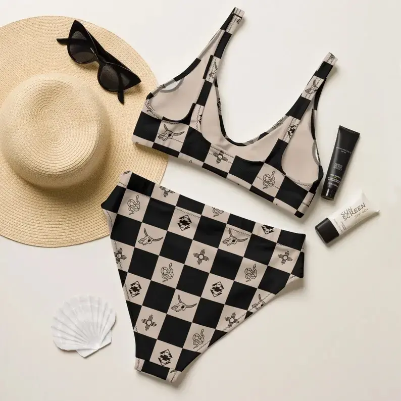 5. Women High Waist Western Cowgirl Bikini Set Black Checker Bull Skull Snake Zia Sun Aztec Print Comfy Swimsuit Country Music Festival Beach Summer