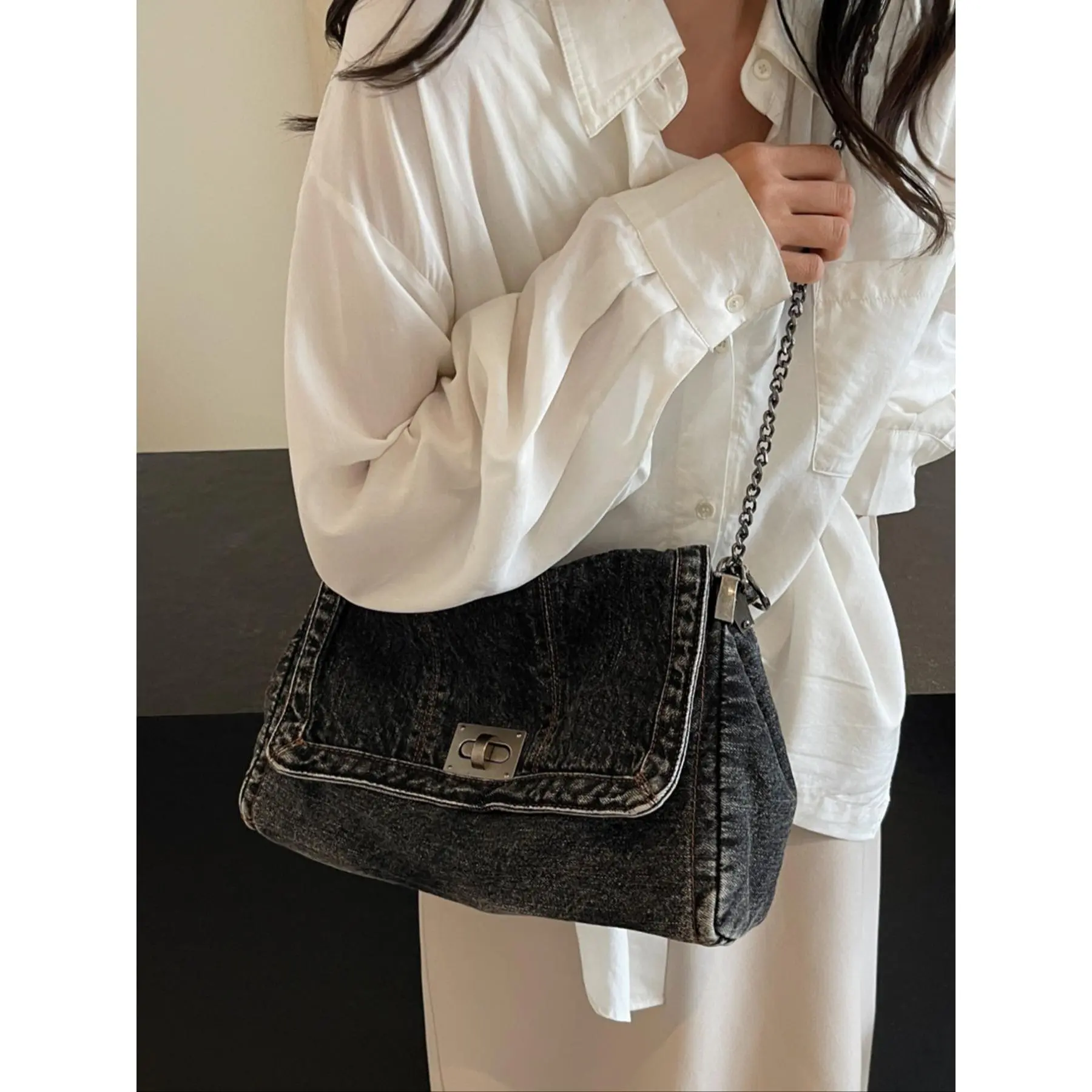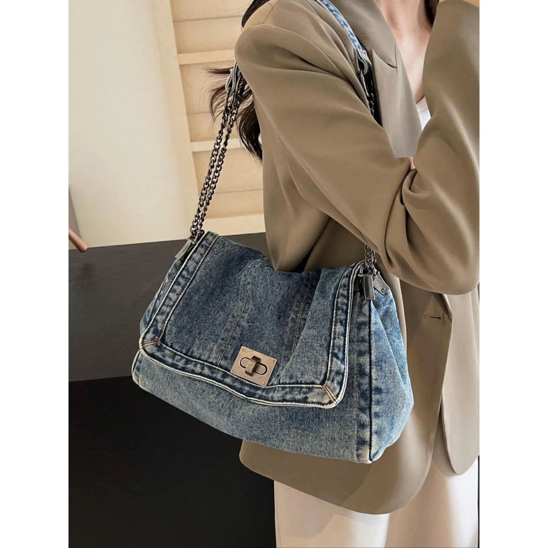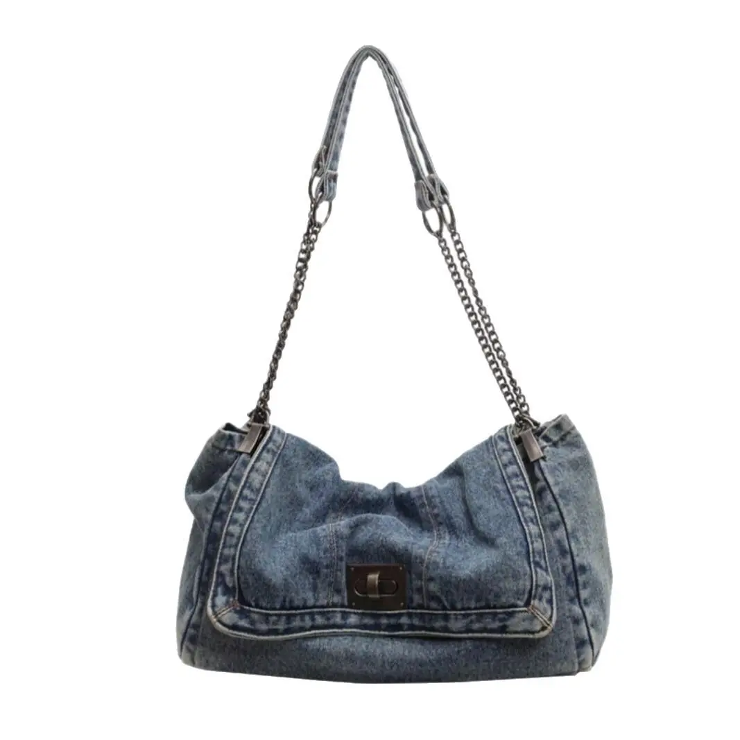 2026 Denim Bag Chain Shoulder Bag Women's Fashion Commuting Work Underarm Bag Vintage Texture Travel Handbag