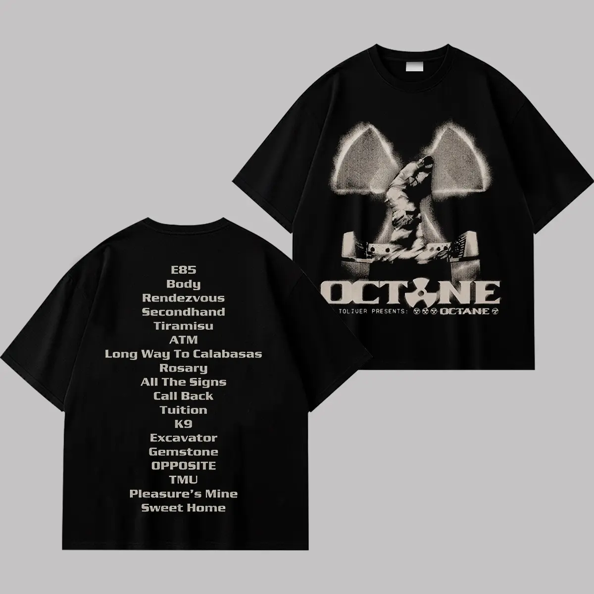 The front features an angel graphic, while the back displays a tracklist print. This design adds an authentic tour merch vibe, appealing to fans. It's a statement piece for rap enthusiasts and streetwear lovers.