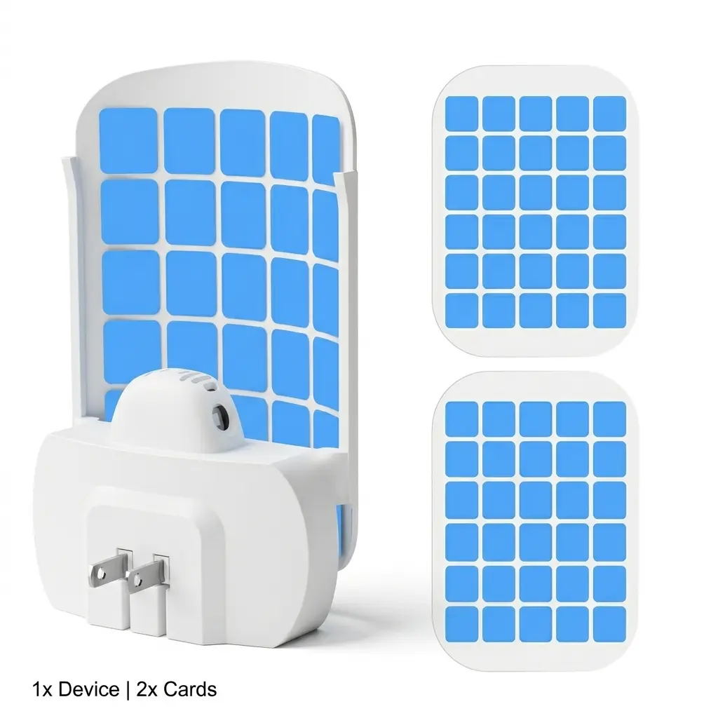 Hate dealing with messy dead bugs? We do too. Our plug-and-play design requires zero maintenance. Just peel the film, insert the card, and plug it in. Toss the full card away without ever touching the bugs! (Includes 1 device & 2 refills).