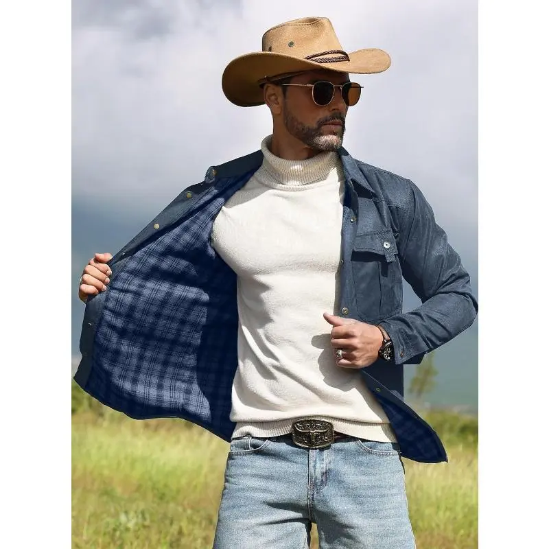Men's Shirt Jacket Shacket with Flannel Lined Casual Snap Button Overshirt Western Cowboy Jackets Fall Clothing memeshirts funny shirts Outfit Tops Long Sleeve Denim Menswear Black Gamis Fashion Biker Beige Collar Collared Plain