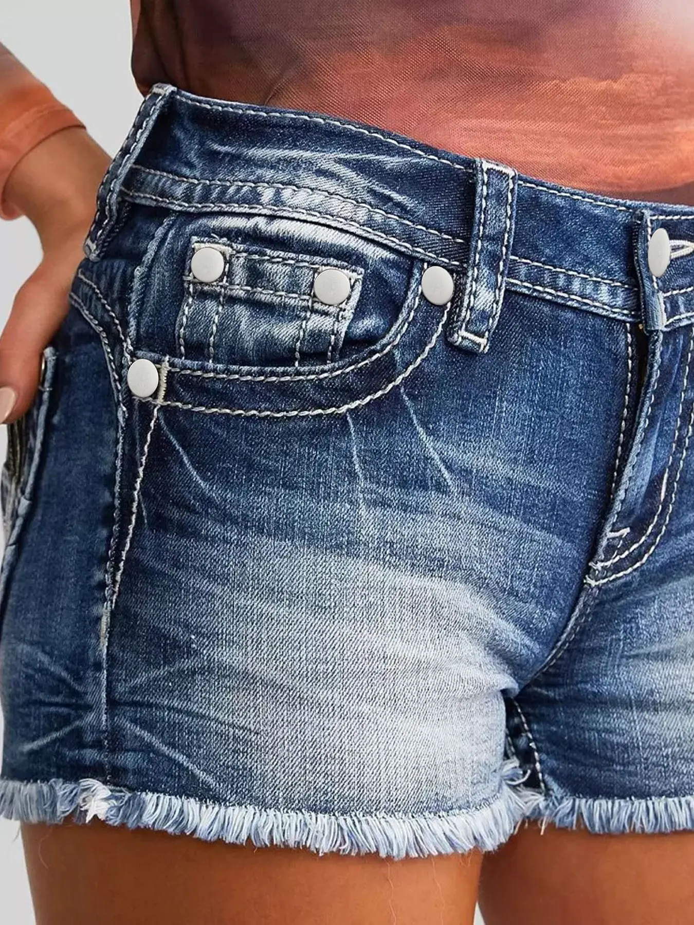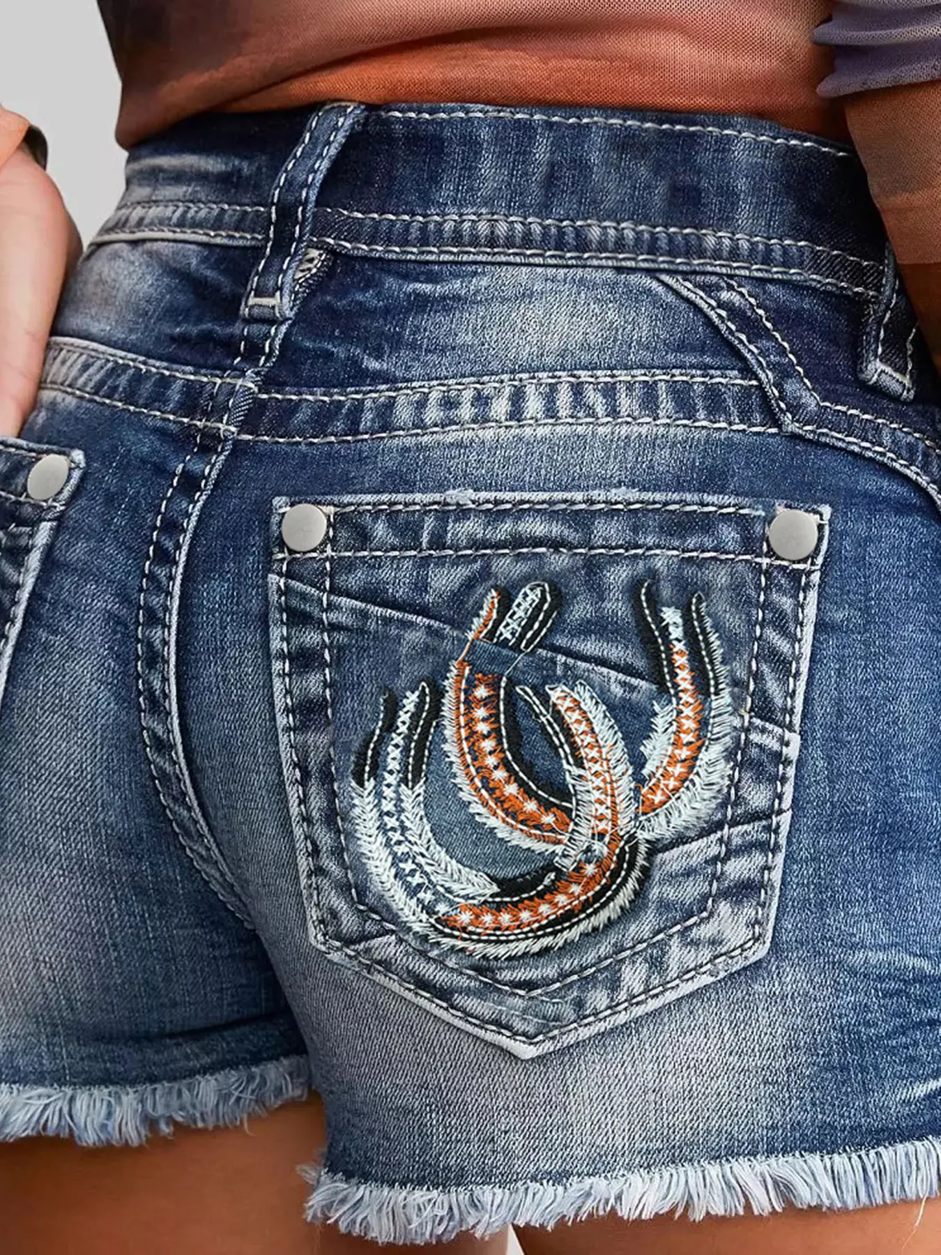 Women's Summer High Waist Denim Shorts with Embroidery and Burr Pocket Casual Trendy Everyday Wear - Womenswear