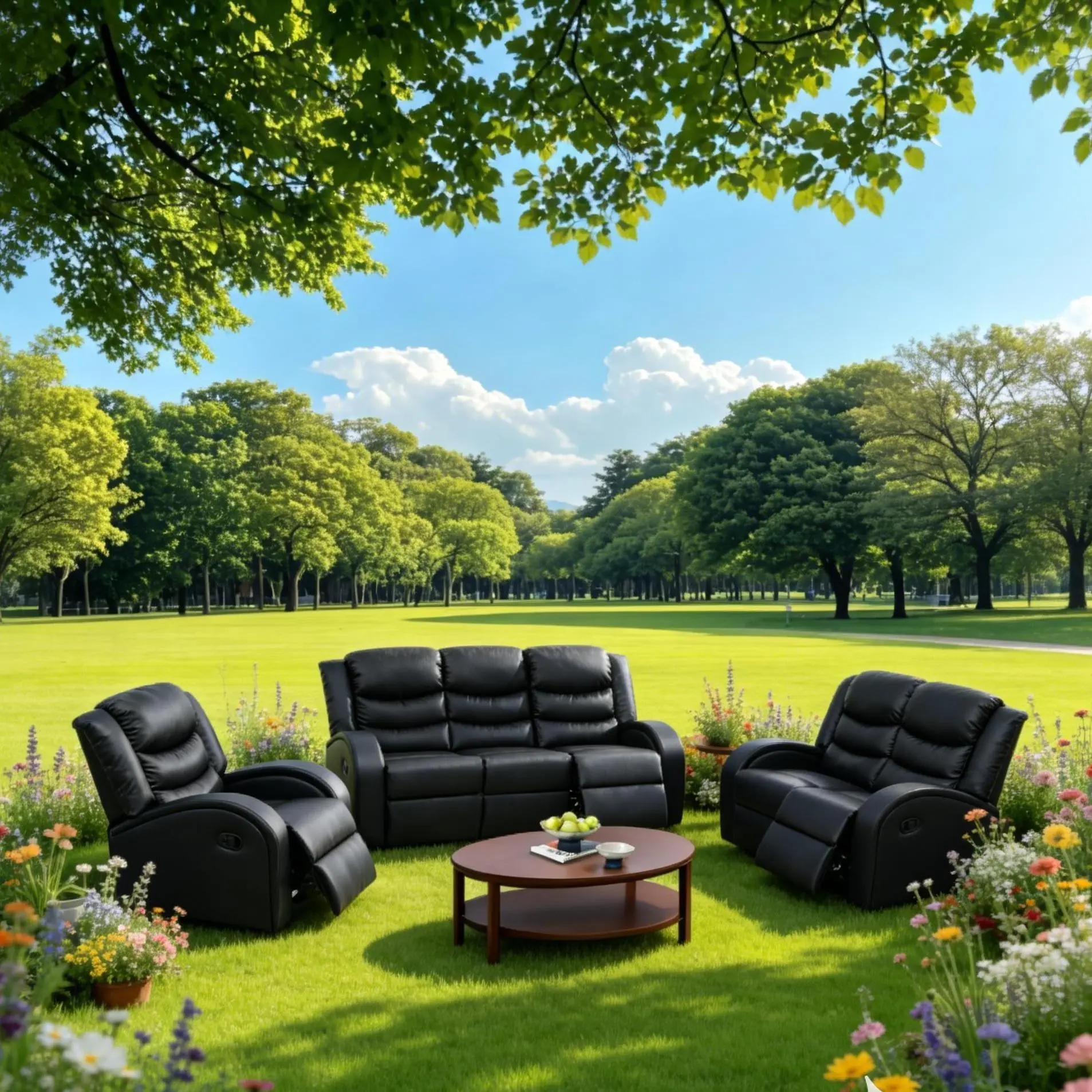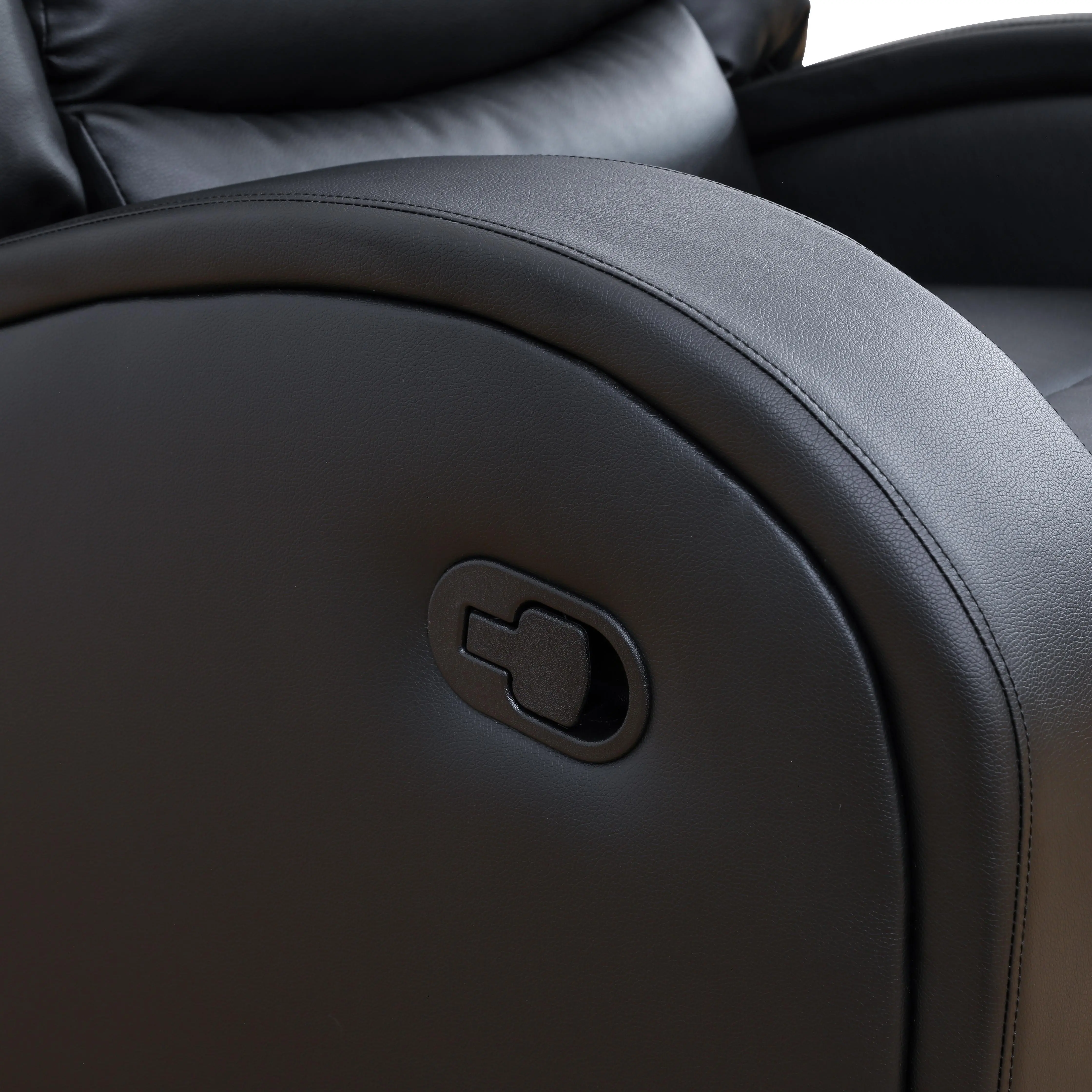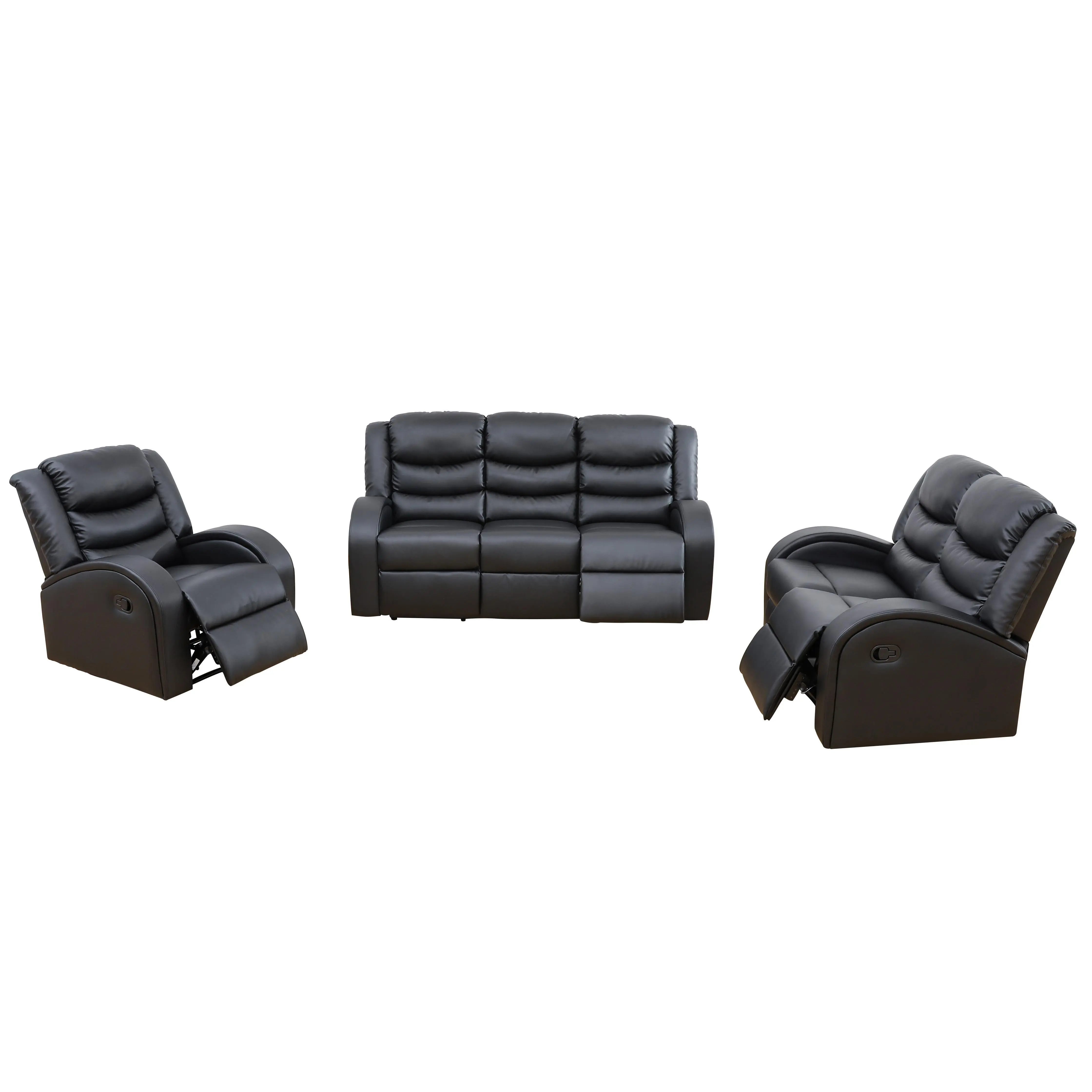 This set is designed for home comfort, offering a sleek black faux synthetic leather finish. It includes a couch and two recliners, perfect for modern living rooms. The set enhances your living space with its elegant design and functionality.