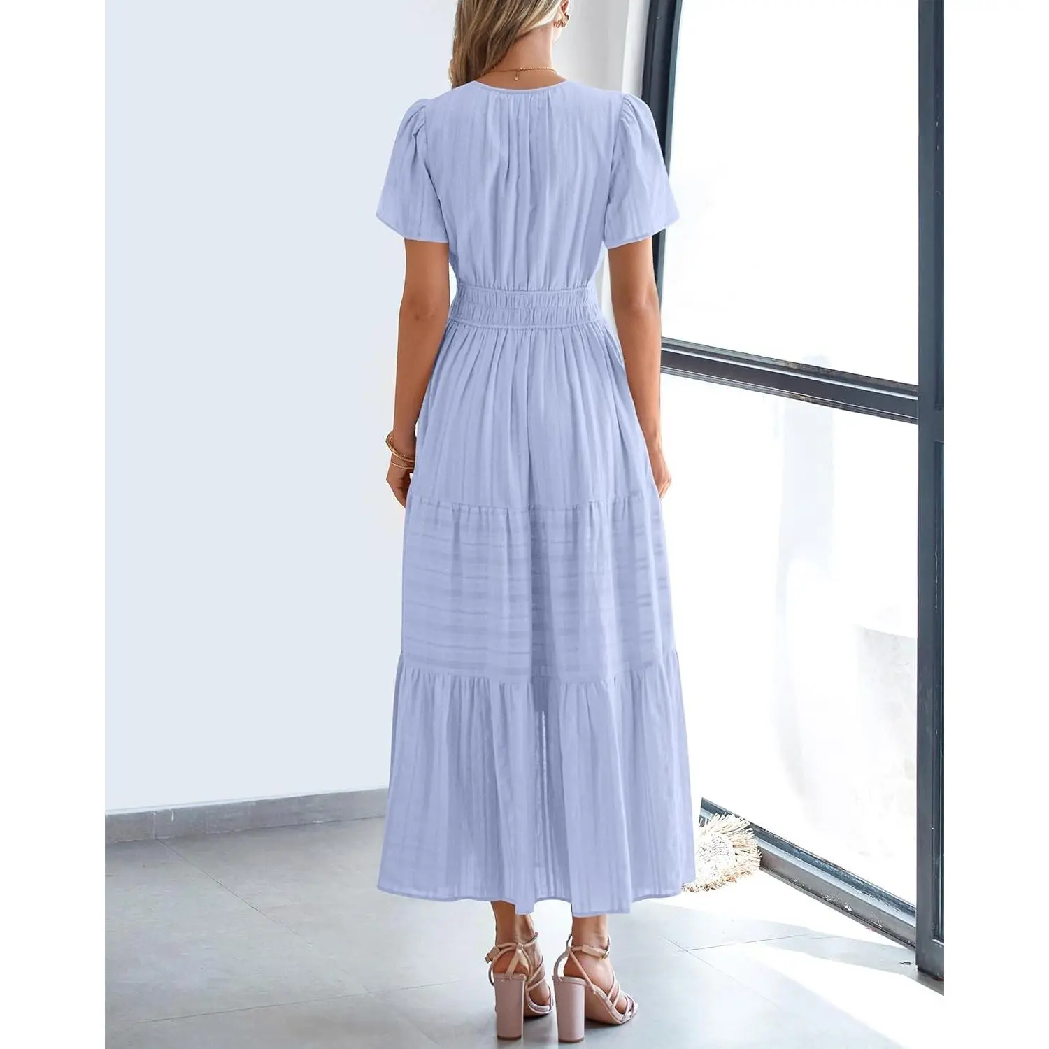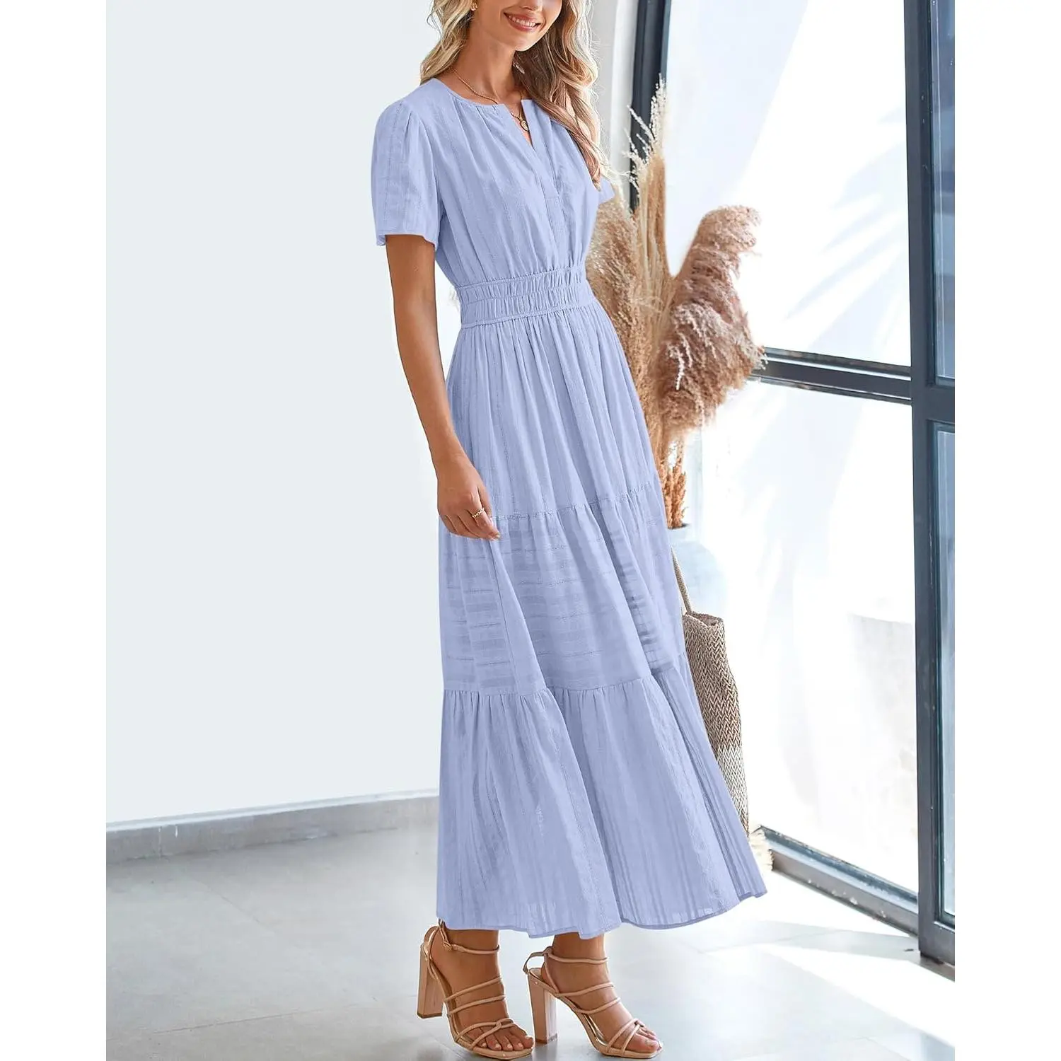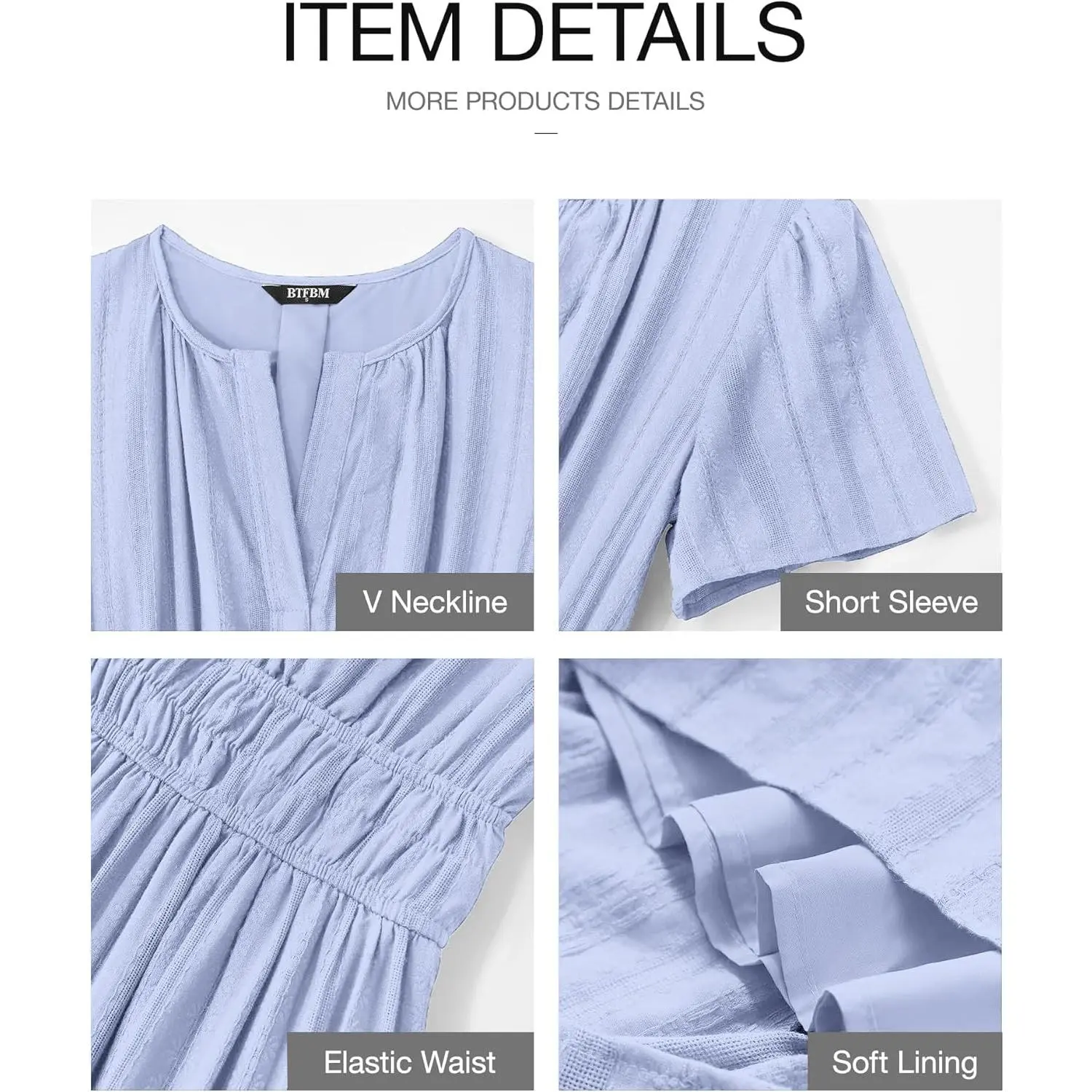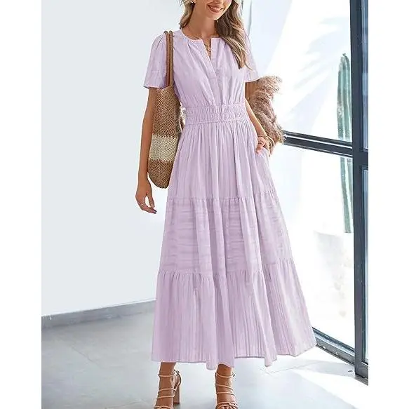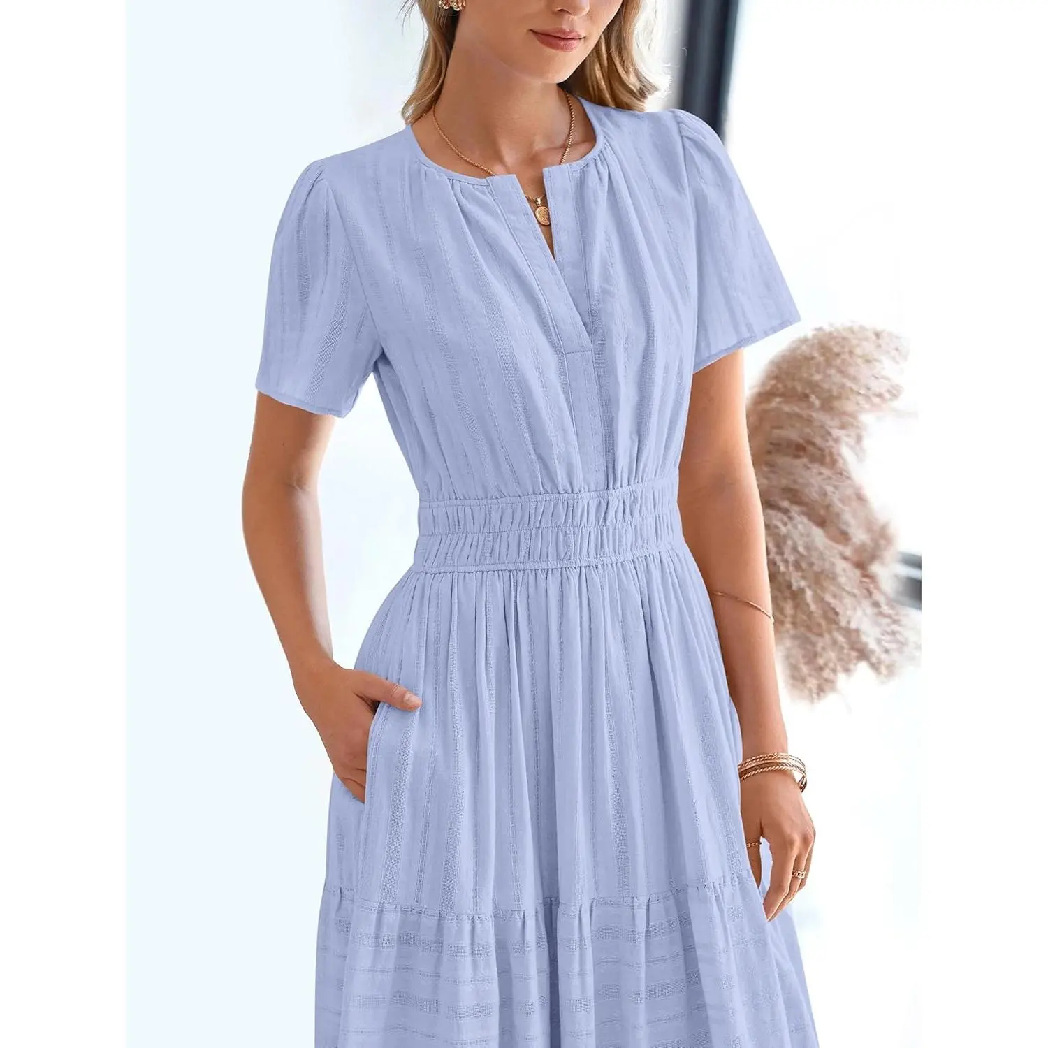 Womens Summer 2026 Casual Midi Maxi Dresses Lightweight Short Sleeve V Neck Elastic Waist Boho Beach Dress Pockets