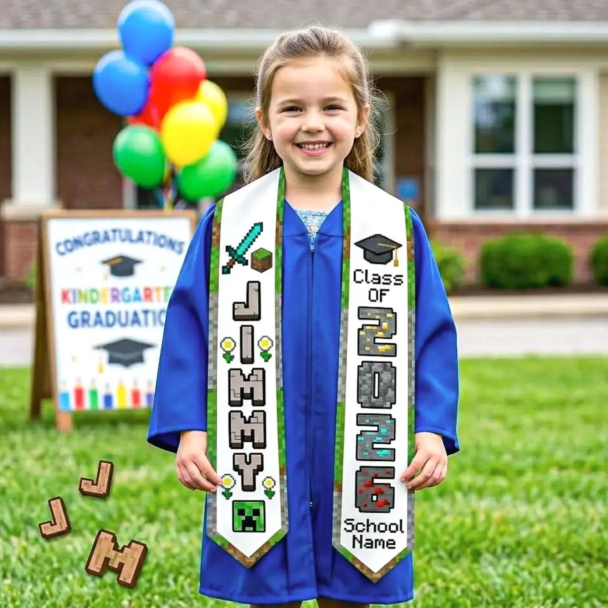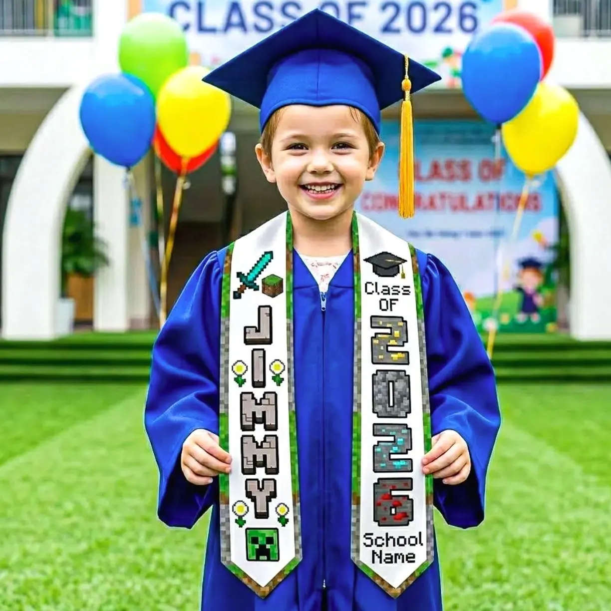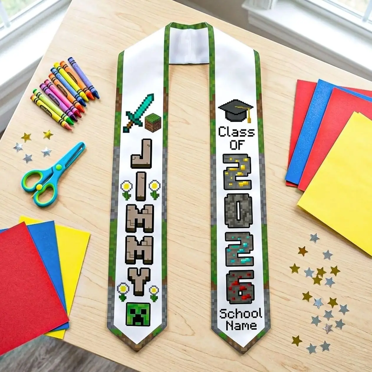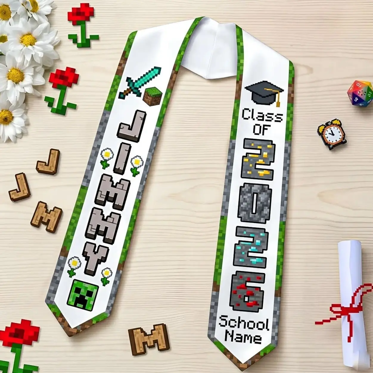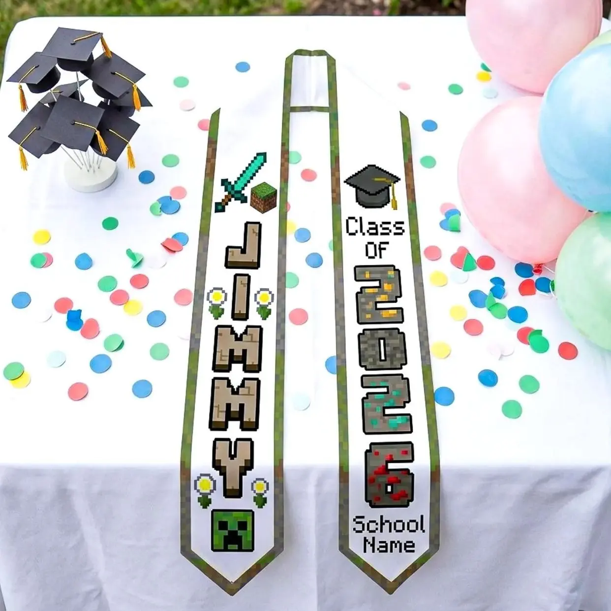 Personalized Pixel Block Style Graduation Stole Class of 2026, Custom Name Pixel Block Sash, Gamer Grad Gift, Kids Graduation Sash Stole