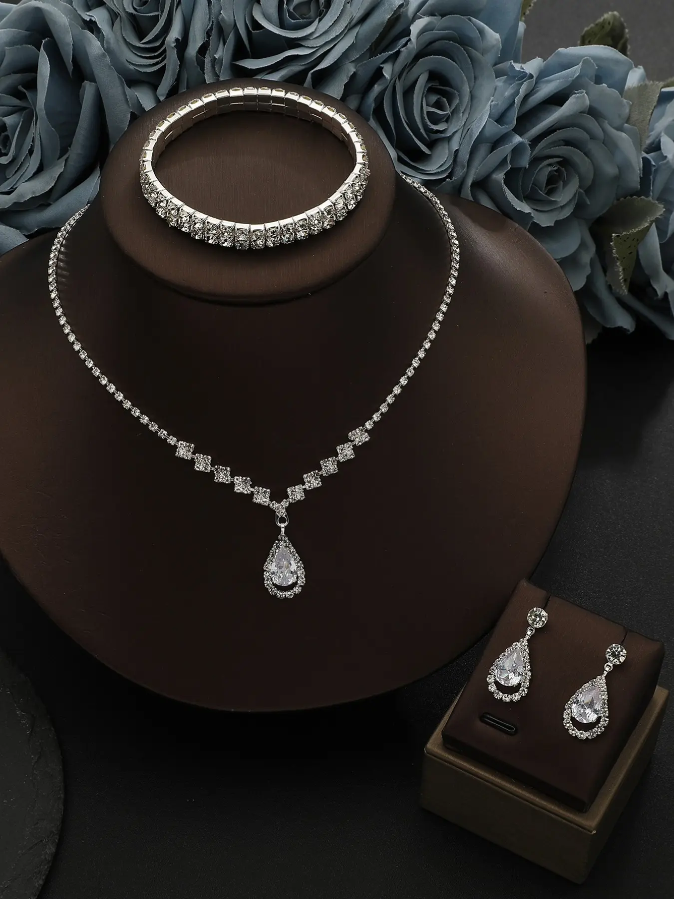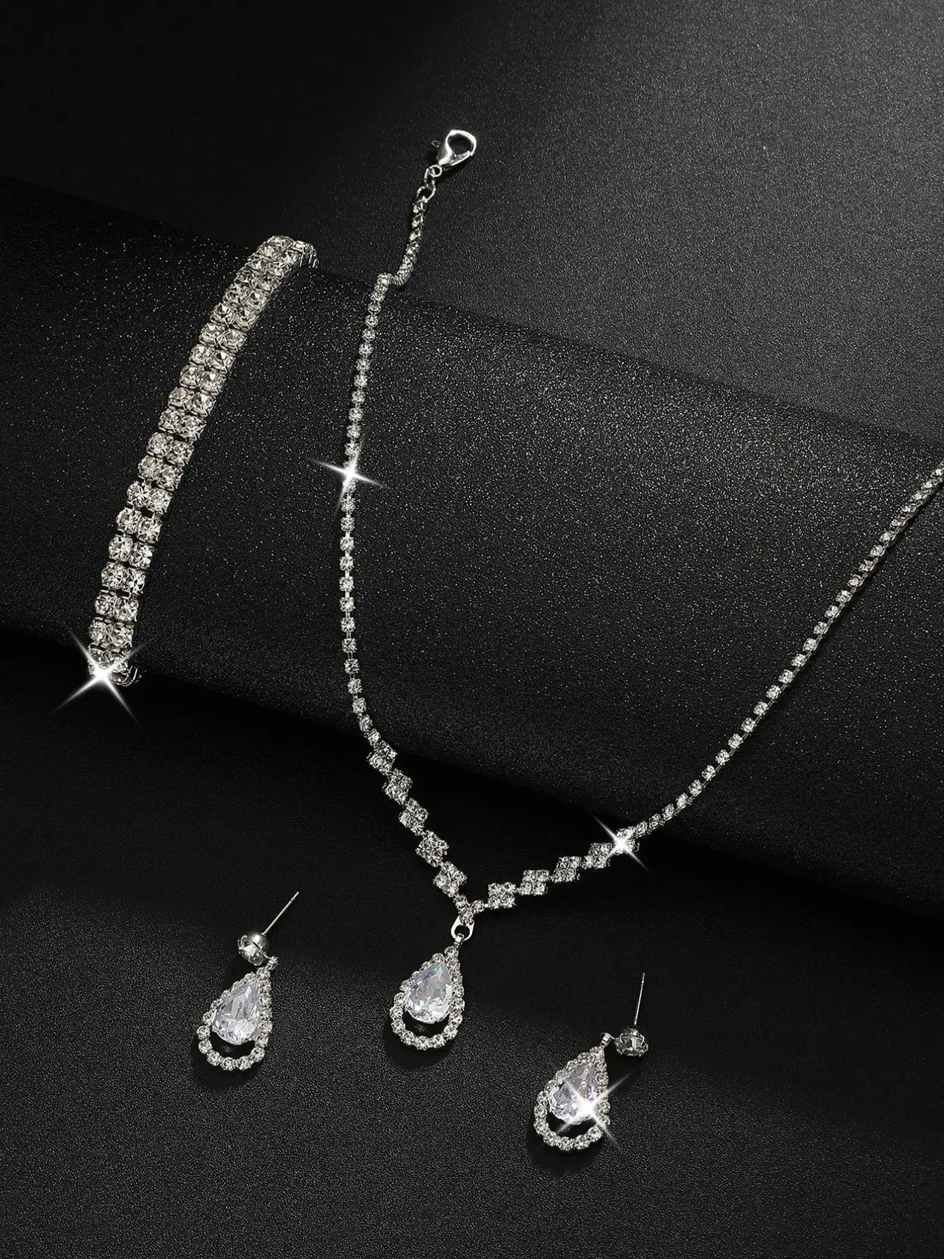 Vintage Luxurious Full Diamond Tennis Chain Set, Teardrop Pendant Necklace Earrings Bracelet, Wedding Accessories, Casual All-Season Jewelry