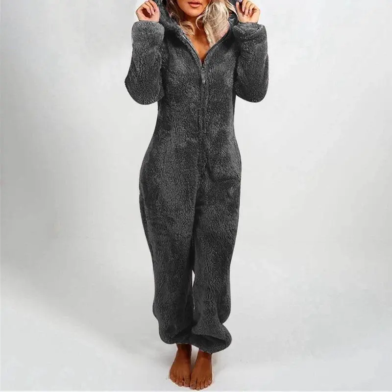 Women Plush 3D Ear Hooded Long Sleeve Jumpsuit Pajamas, Suitable For Autumn/Winter S-5XL Can be used with raincoat