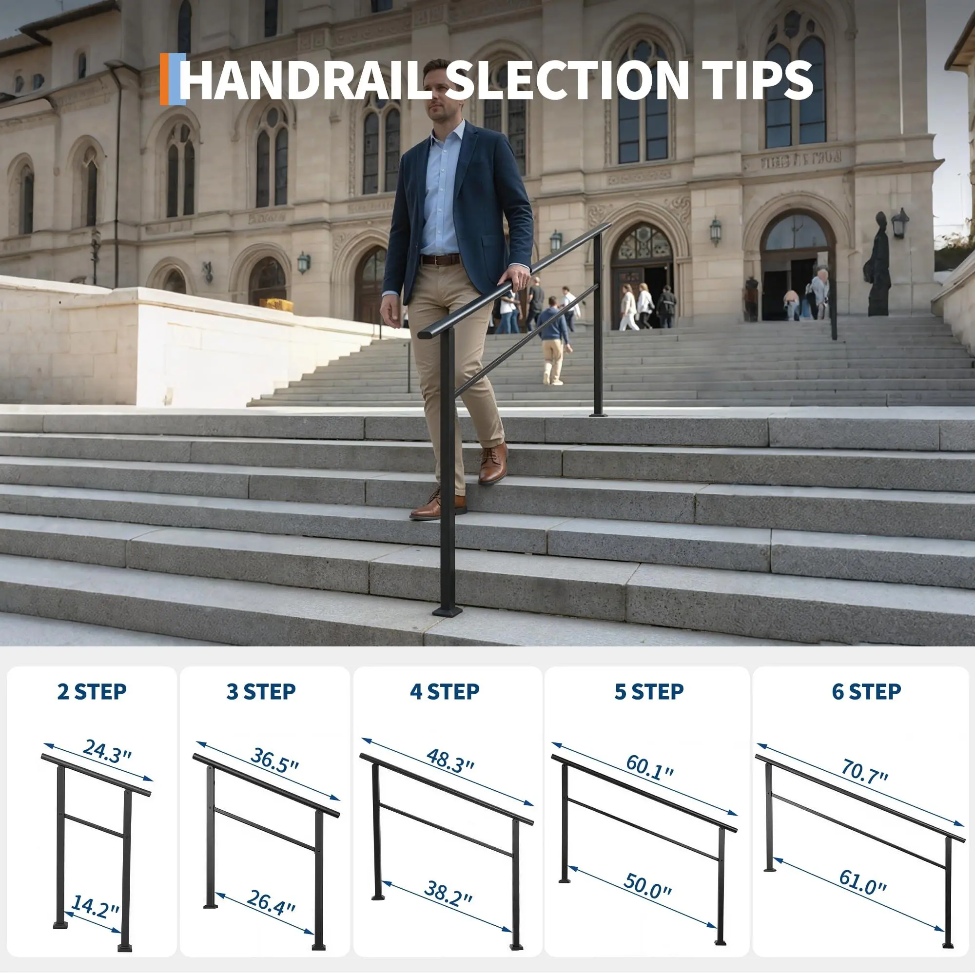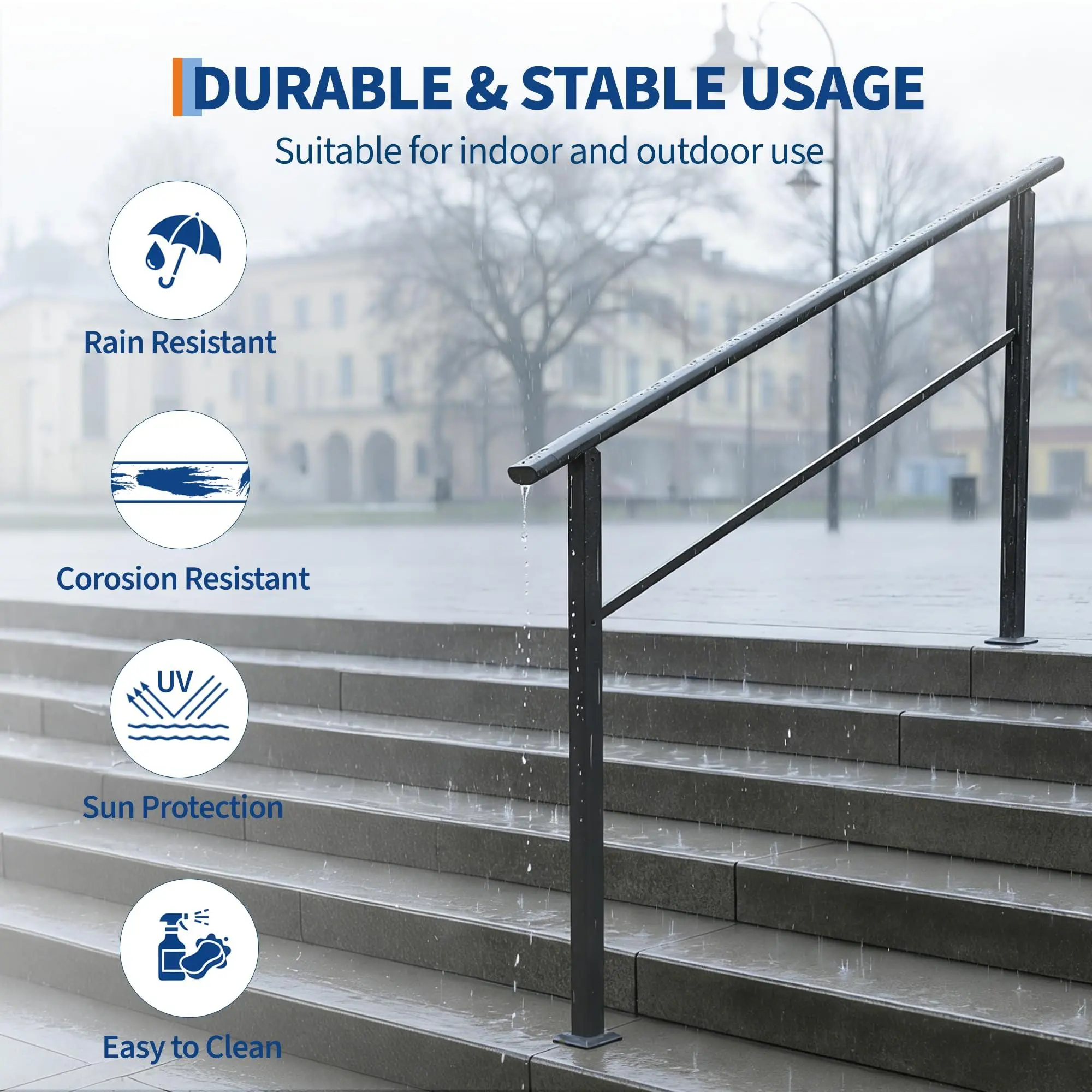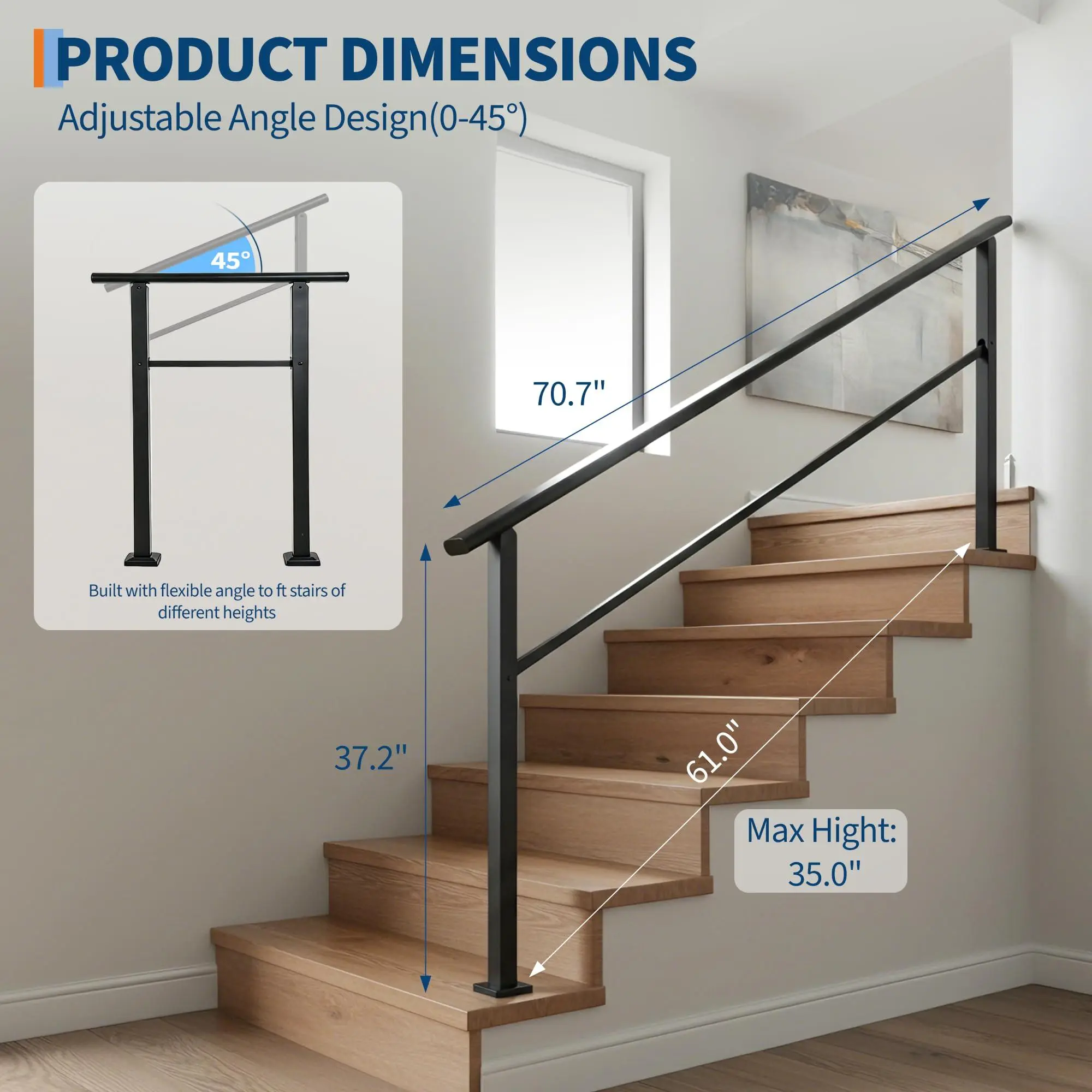 Adjustable from 0° to 45° for Flexible Installation - The 6 step stair handrail can be adjusted from 0 to 45 degrees, allowing it to perfectly fit the slope of most standard 6 step (6-riser) staircases. This versatile design also enables installation on horizontal surfaces, such as alongside a walkway or at a flat entrance, providing support where you need it most