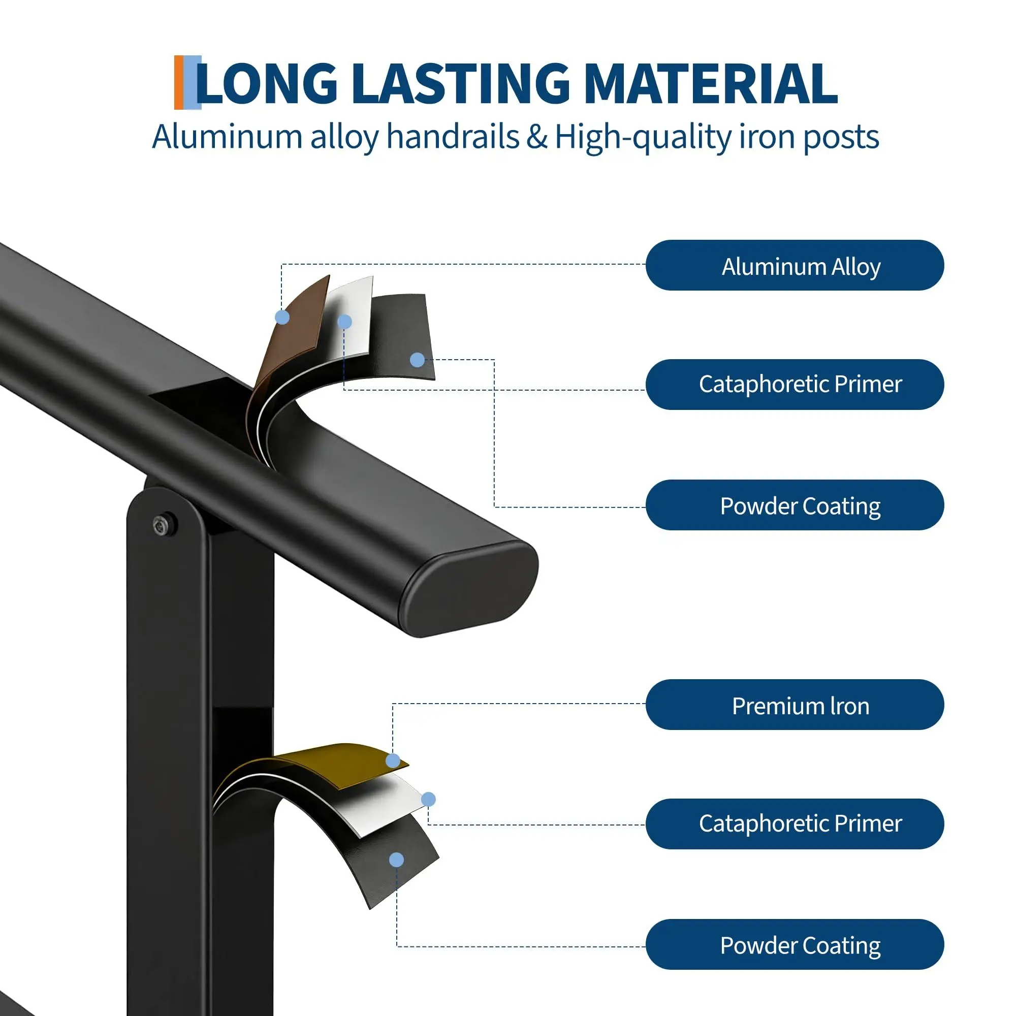 Cataphoretic Primer & Powder Coating - This Garvee outdoor handrail features a durable black finish achieved through a two-step process: electrophoresis for deep corrosion resistance followed by powder coating for a smooth, protective outer layer. This combination effectively shields the metal from rust, scratches, and UV fading, ensuring long-lasting durability in rain, sun, and snow