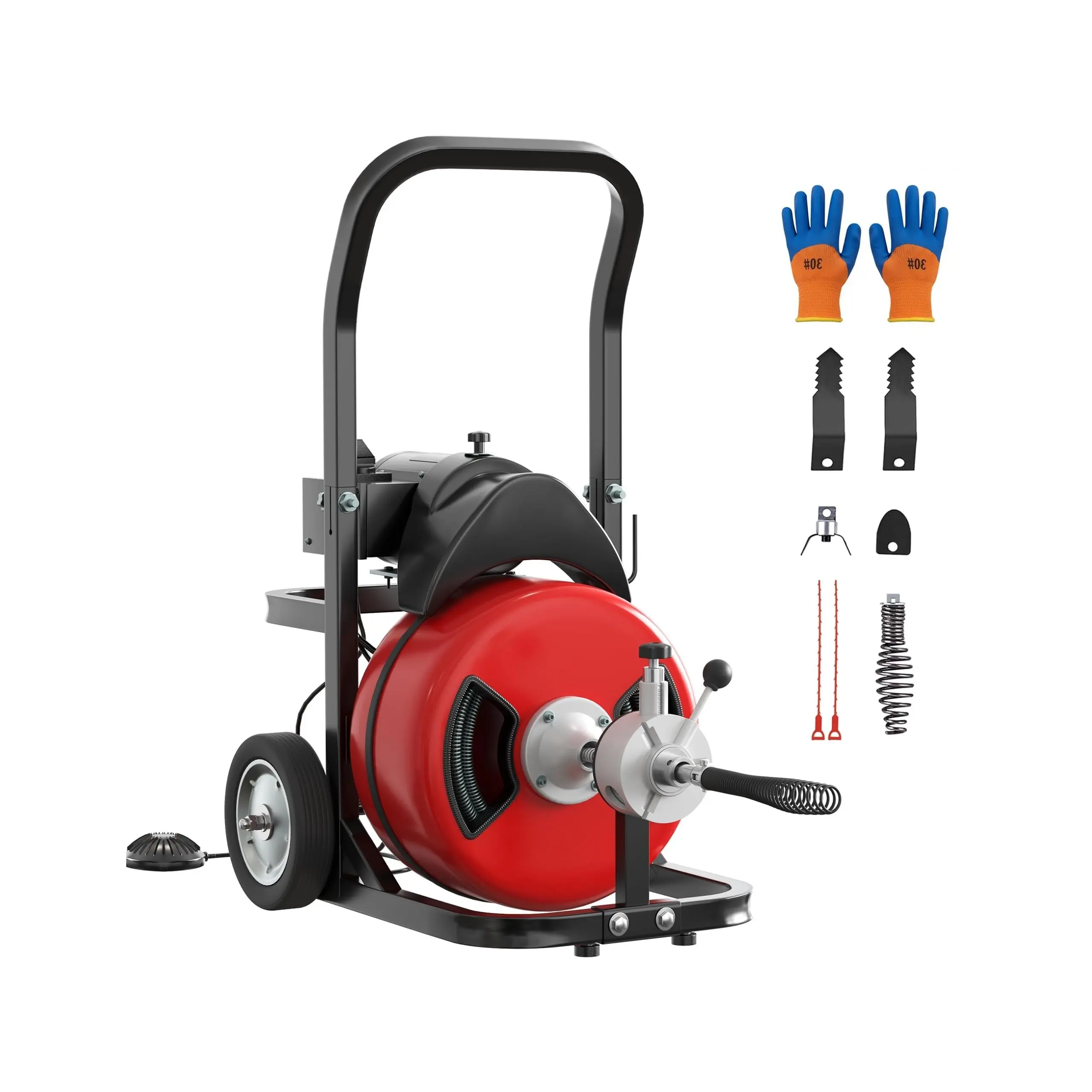 Complete Professional Kit: Ready for immediate use on a wide range of clogs. Includes machine, cable, cutters, and foot switch for a comprehensive drain cleaning solution.