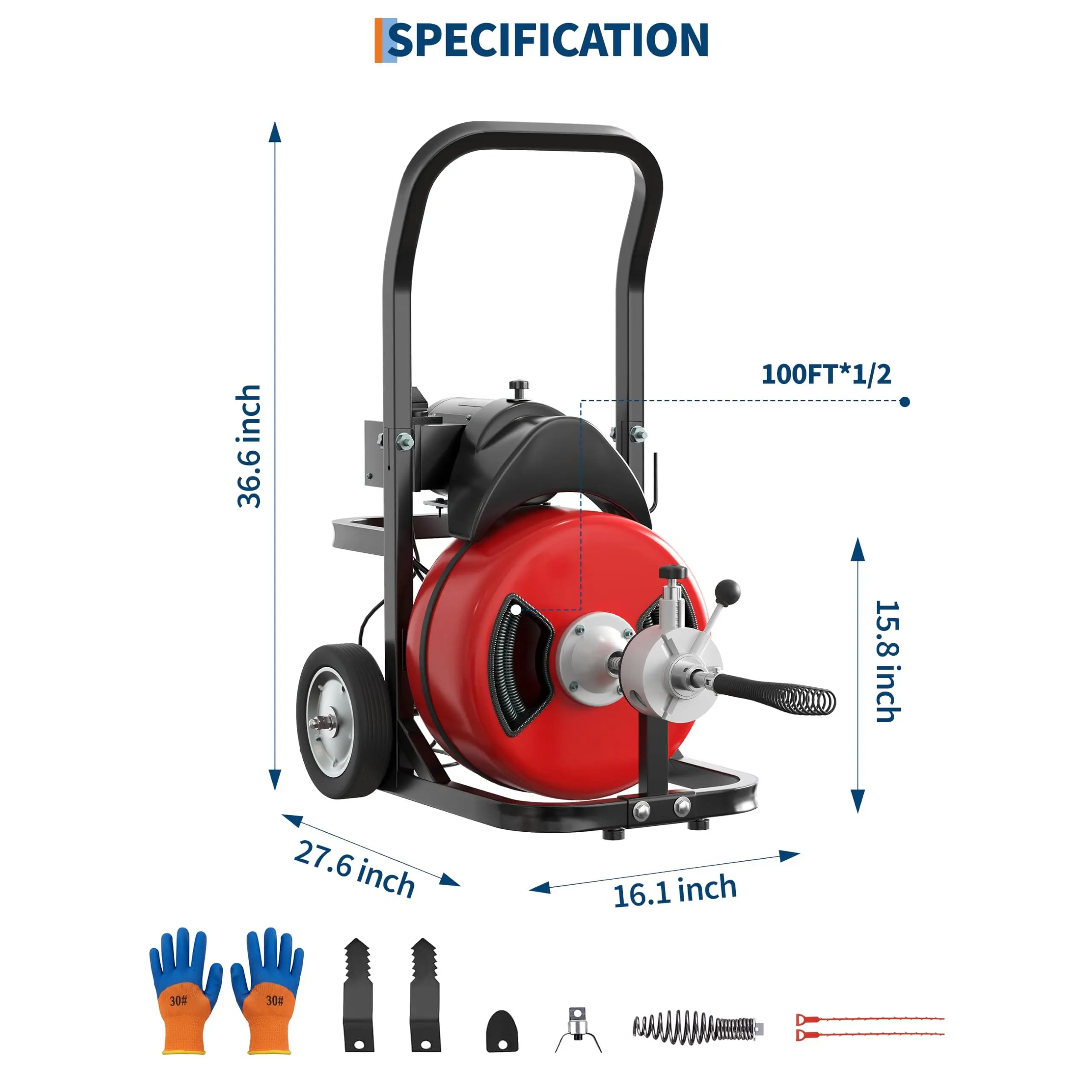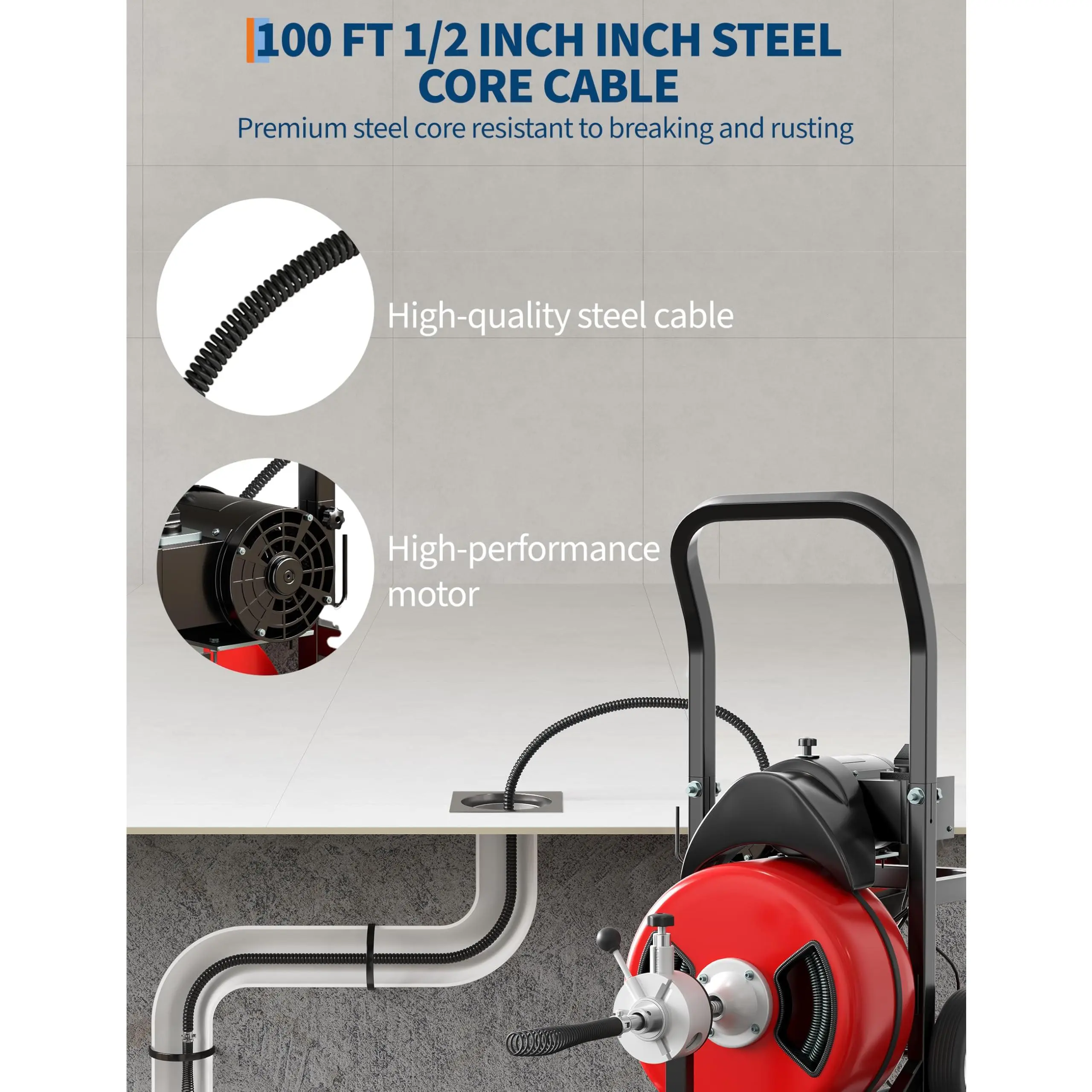 100FT x 1/2" Heavy-Duty Cable: Extensive reach clears deep blockages. Durable 1/2" diameter cable paired with included cutters powers through roots, grease, and solid waste.
