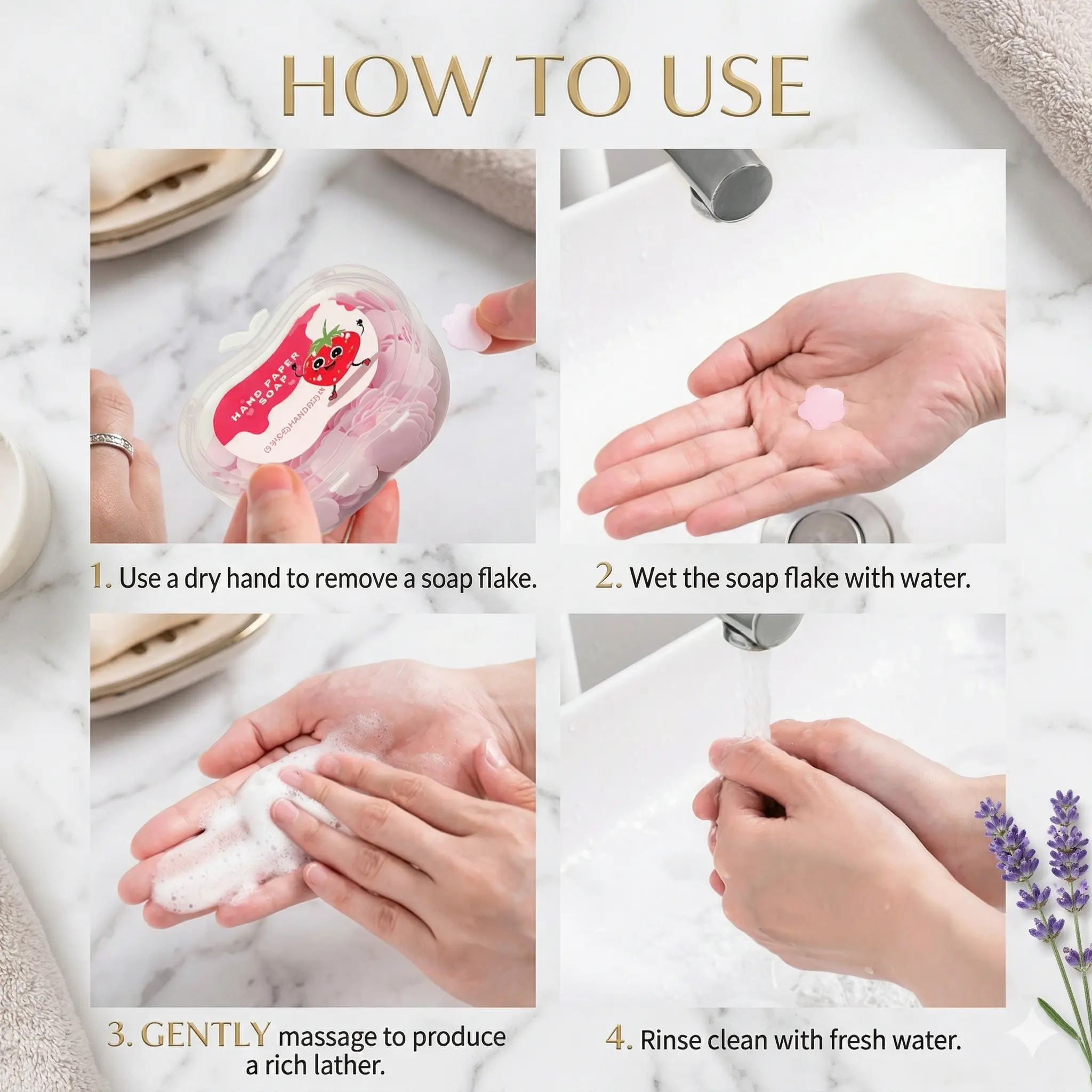 [Instant Lather & Easy to Use] These sheets dissolve completely in seconds when mixed with water. Just one petal provides enough rich lather for a thorough wash, leaving no messy residue behind.