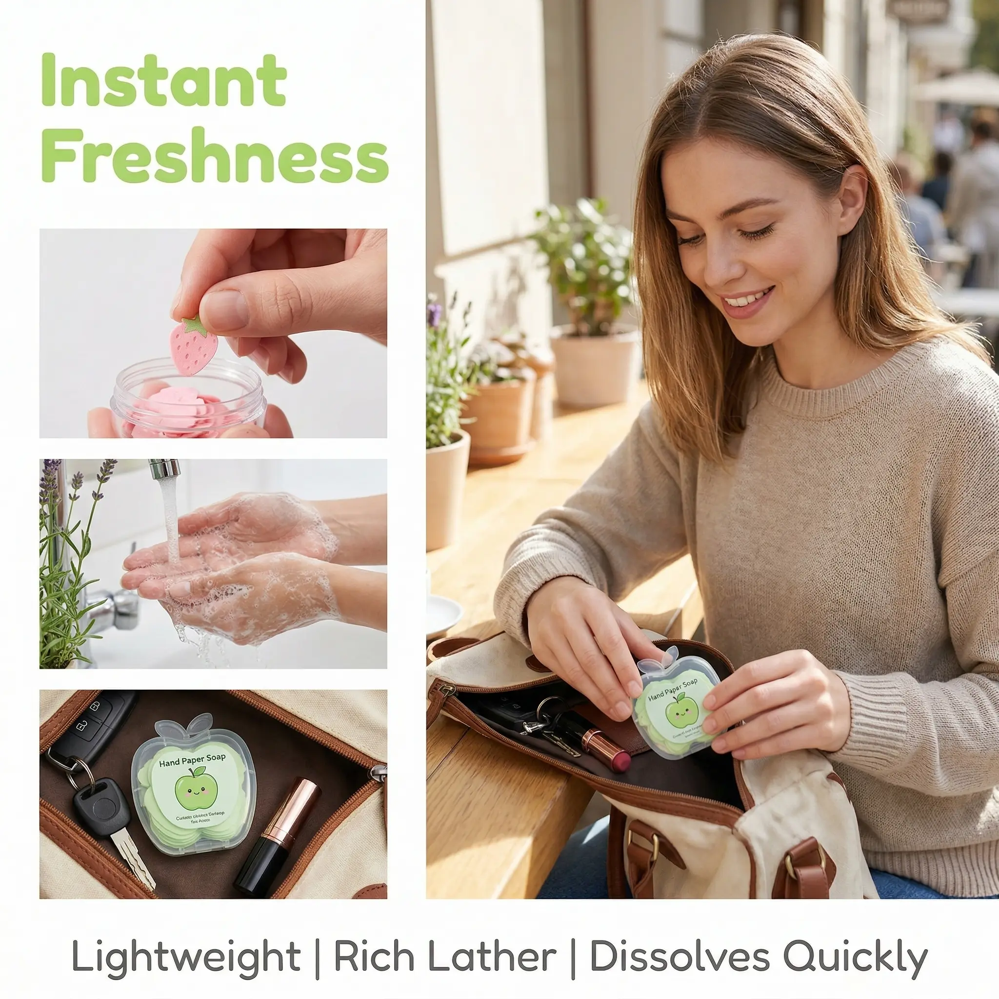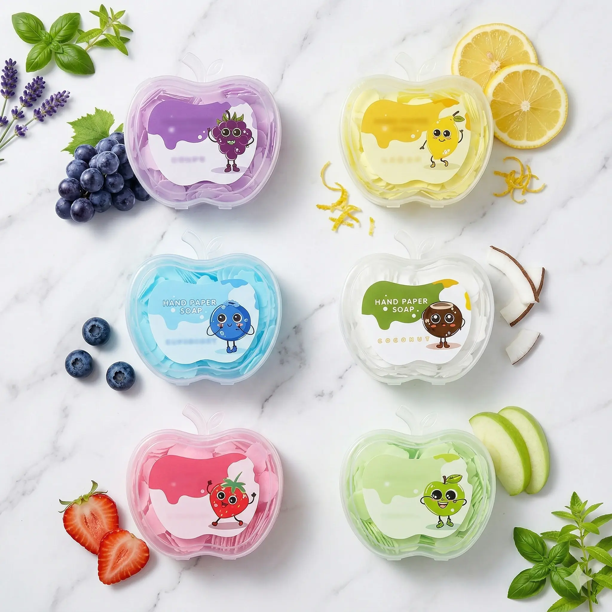Keep Clean and Fresh, Wherever Life Takes You. Tired of finding empty soap dispensers in public restrooms or messy liquid spills in your bag? Our 6-Pack Petal Soap Sheets are the ultimate solution for on-the-go hygiene. Each adorable apple-shaped case holds 120 delicate soap petals that transform into a luxurious lather with just a splash of water.