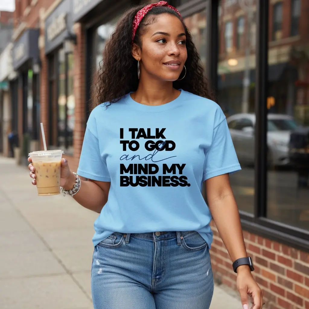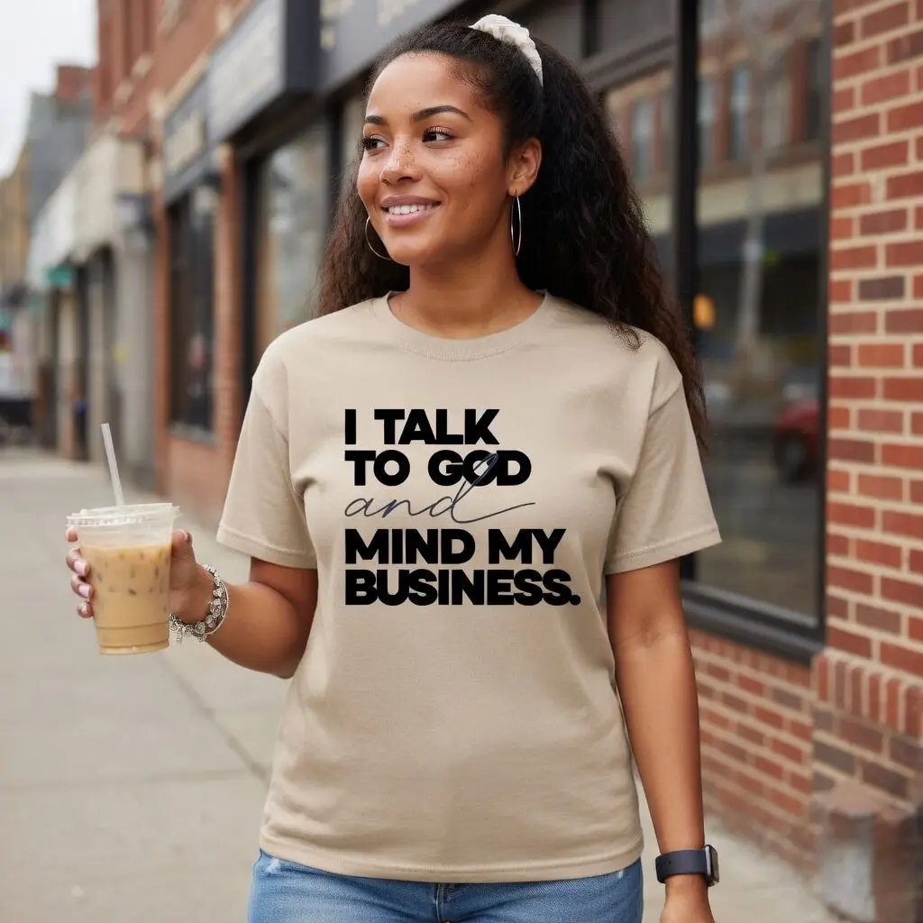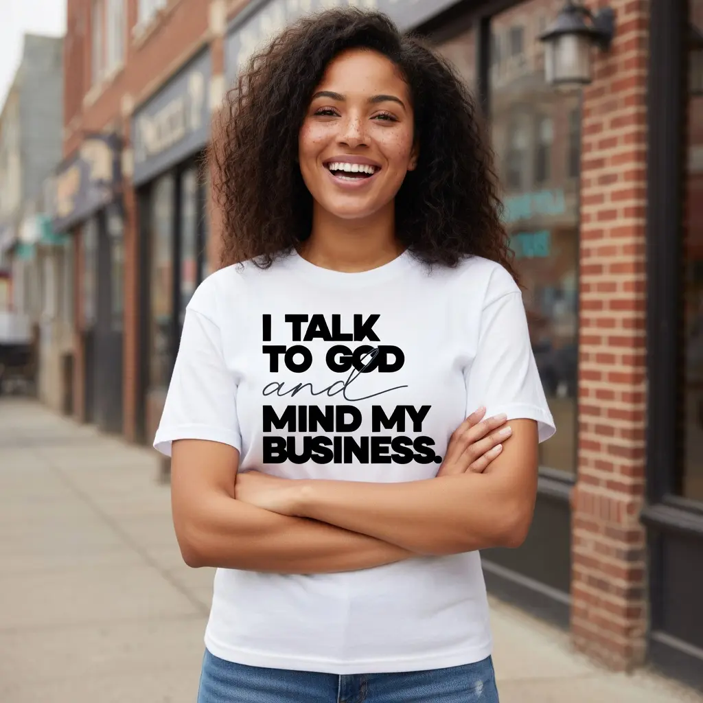 Make a confident statement with this striking black tee featuring the empowering phrase “I Talk to God and Mind My Business” in bold, high-contrast typography. The mix of strong block lettering and elegant script adds a stylish edge, while the clean layout keeps it modern and versatile. Perfect for women who walk in faith and keep their focus, this design blends attitude, spirituality, and everyday fashion effortlessly.