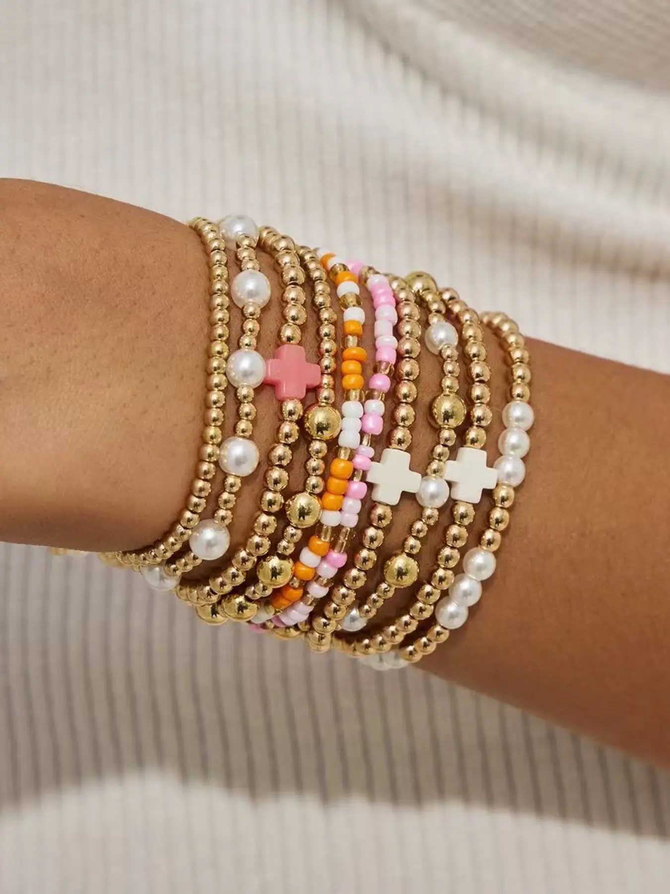 Boho Stackable Beaded Bracelets for Women, Gold Pearl Elastic Bracelet Set, Summer Beach Bohemian Jewelry, Colorful Cross Charm Wrist Bracelets, Daily Wear Gift for Her