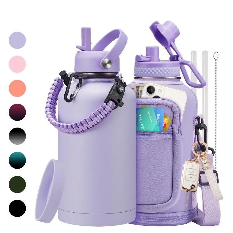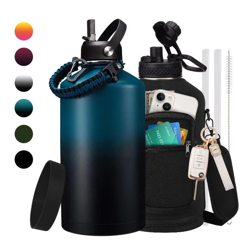 32oz 40oz 64oz Insulated Stainless Steel Water Bottle, Gallon Flask Water Bottle - Big Water Jug with Straw & Spout Lid, Paracord Handle, Carrier Bag